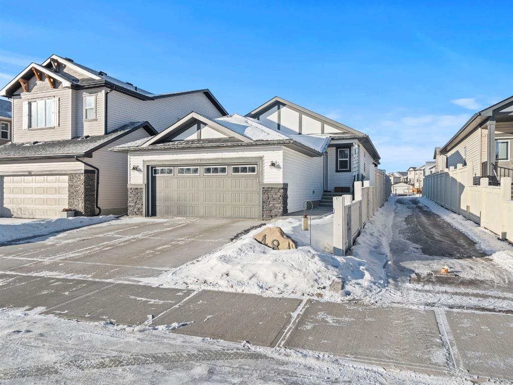 Welcome to the quiet neighbourhood of Drake Landing! Built in 2017, this beautiful, move-in ready bungalow is fully finished, well-kept, low maintenance, on a quiet street and has back alley access! The main floor features a large kitchen with a fantastic layout, large island, which is perfect for gathering and entertaining, quartz countertops, ample counter space and storage, stainless appliances and large corner pantry. There’s also a bright front entry, tranquil living room with large windows and fireplace, a 2-piece bath, beautiful vaulted ceilings in the living room and primary bedroom, with 4-piece ensuite and walk-in closet. The basement boasts a full bedroom, full bathroom, family room, billiards room and bar area, which can also be used as a home office location. You can also convert the family room to an additional 3rd bedroom with one wall (closet and a window are already in place). The double attached garage is fully insulated and heated for Alberta’s cool winters. Outside is peaceful and private, completely fenced, fully landscaped, has a mixture of low maintenance rock in the front, grass in the back, back deck with pergola, natural gas BBQ hookup and an area for a fire pit. This air conditioned home also offers access to an abundance of walking paths, great proximity to schools, parks, shopping and convenience. Pride of ownership shines throughout this home!! Come and see it today!