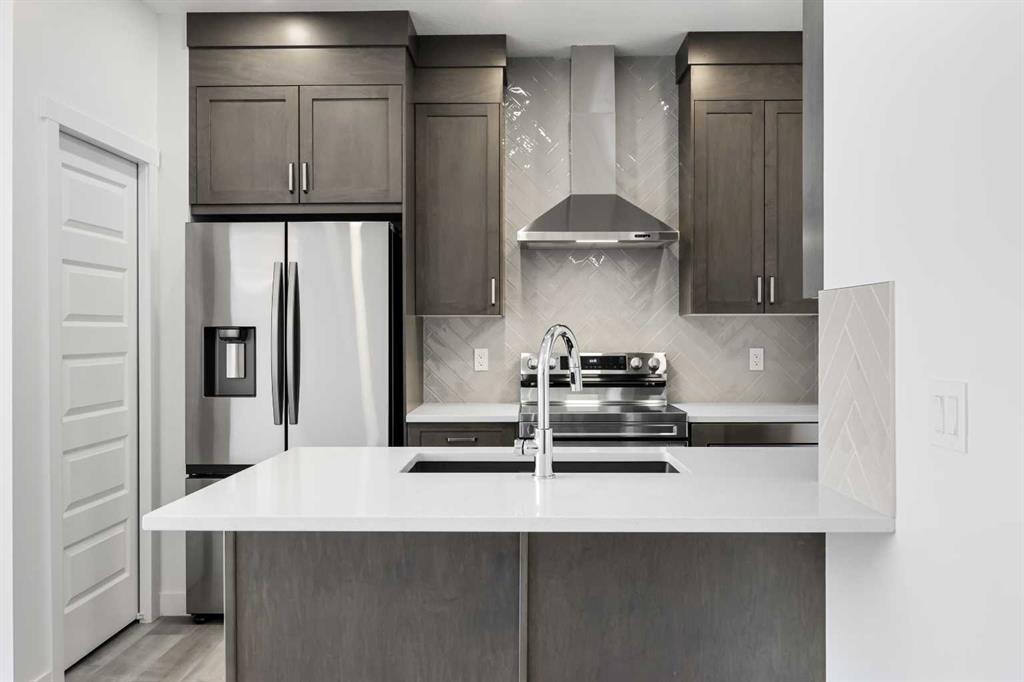 Genesis Builders introduces the Eli - a luxury street-side luxury townhome with NO CONDO FEES ready for IMMEDIATE possesion! The Eli townhome offers an attached double garage with a rooftop patio and offers low-maintenance living. The thoughtfully designed home offers over 1500 sq ft. plus an unfinished basement with 9' ceilings, ready for your ideas. Large windows and soaring ceilings on the main floor allow natural light to flow into the open-concept living space. The chef-inspired kitchen offers sleek cabinetry and stone countertops and is well-equipped with stainless steel appliances. The kitchen is tucked away, allowing for so much room for activites in the open-concept dining and living room space. A floor-to-ceiling tiled fireplace is the living room's focal point. Complimenting the main floor is a convenient half bath, storage and access to the attached 20 x 22 garage, large enough for a truck. Venturing upstairs, you will find a spacious primary retreat with a spa-like ensuite featuring a spacious shower, his and hers sinks and a walk-in closet. Two additional bedrooms, a full bath, a flex room, a 4-piece bath and laundry complete the upper level. Enjoy spending time on your upper rooftop patio, which is situated above the garage and is an excellent space for entertaining. Bayview is a beautiful community with parks, benches and pathways that meander throughout the community and along the canals. Kids and adults alike will enjoy the outdoor basketball nets, gym, amphitheatre and tennis courts that will convert into a skating rink in the winter. Come and see all the amenities the community offers for yourself! *Photos are of a previously sold model and are representative. Area size was calculated by applying the RMS to the blueprints provided by the builder. Taxes to be assessed*