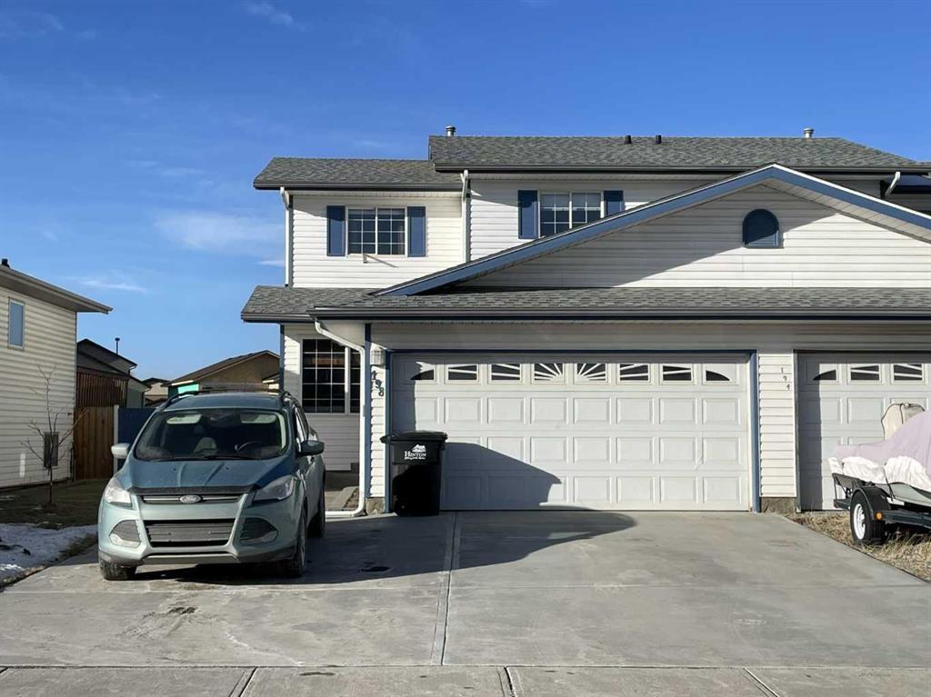 Well cared for with many updates throughout, this 4 bedroom ½ duplex is ready for a new home owner. The efficient layout & location are great for the first-time buyer, established family or investment property. The renovated kitchen includes newer backsplash, paint, refinished cabinets & stainless-steel appliances. Access from the dining area to a new covered deck is highly convenient & can be enjoyed in any season. A cozy living room with a detachable electric fireplace, a 2 piece bathroom, laundry & access to the heated, double garage complete the main level. New & modern vinyl flooring leads to the upper floor. The primary bedroom features a walk-in closet & 4 piece ensuite with new vanity. A new vanity & vinyl flooring has also been updated in the 4 piece main bathroom to accommodate the additional 2 bedrooms. The basement is fully developed with new drop ceiling throughout, family room & a 4th bedroom. The shingles were replaced & the driveway was paved in 2020. There is plenty of room for every day vehicles & RV parking. The fenced yard is spacious & includes a large storage shed & greenhouse. Located moments shopping, amenities, park & walking trails, this 2 story home is a complete package.