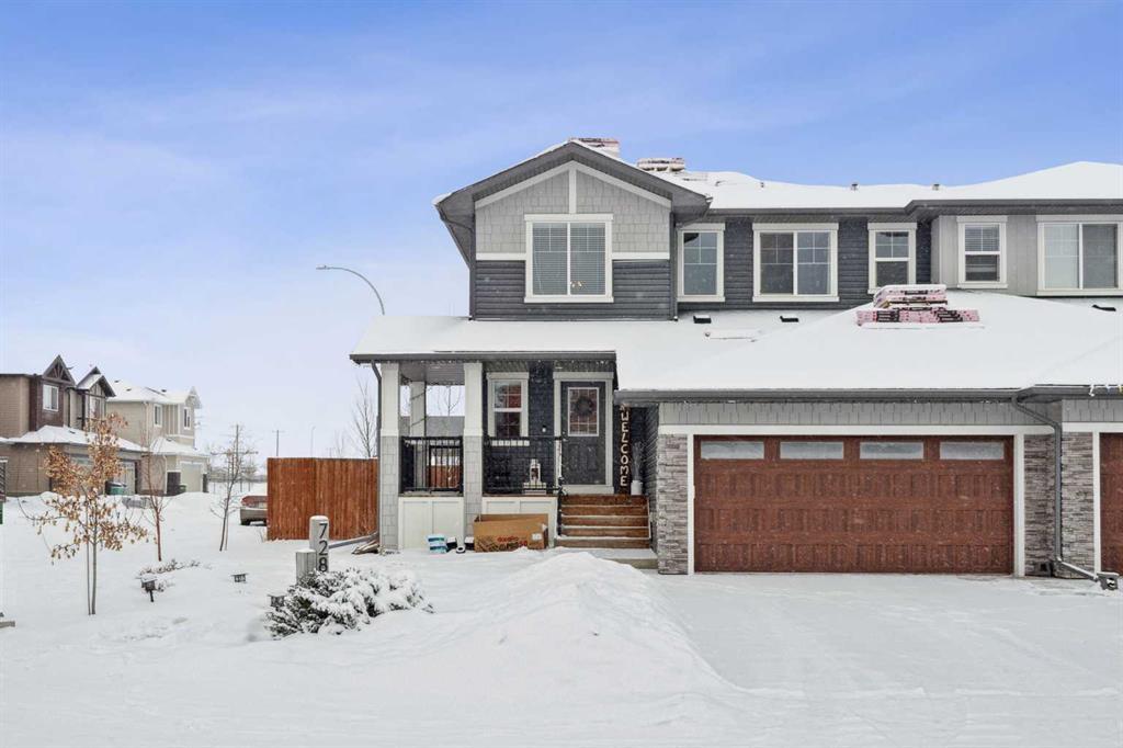 Amazing Value! Welcome home to this Beautiful 2 Storey Semi-Attached House located in one of Strathmore's most sought-after New Communities! Situated on a large corner lot, on a quiet street this property is the definition of a Charming Family home. Enter via a wraparound front porch to a bright and open 2 storey foyer. The main floor is bright and open, filled with immense natural light from large windows. The Living room flows seamlessly into the kitchen and dining area, it also features a gas fireplace and ceiling fan. The kitchen is bright and inviting with white cabinetry, stainless steel appliances and quartz counter tops. From the kitchen there is a fantastic walkthrough pantry to the mudroom and then to the large double garage. The upper floor is a fantastic layout with an upstairs laundry room, 2 large kid's bedrooms and a centrally located 4-piece bathroom. The primary suite finishes off the second storey, with a full 4-piece ensuite bathroom and large walk-in closet. The basement is fully developed and wide open for a ton of usable space. Also located on the lower level is another 4-piece bathroom. Some of the other upgrades this home offers are, water softening system, dimmable lights, new hot water tank and central vacuum system. There is a double front drive garage that has been insulated and drywalled. The large corner lot is impressive with a fully fenced back yard, lots of trees and shrubs as well a fantastic covered rear deck and a ground level patio. This home is surely one you won't want to miss, schedule your private showing today! Brand NEW Roof being installed currently.