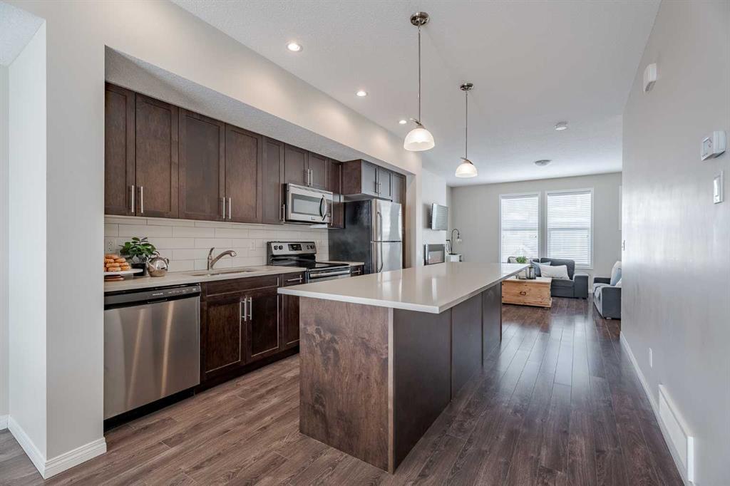 Step into modern living with this stylish townhome designed for those who love to entertain and live effortlessly. Featuring 2 bedrooms, 2.5 baths, and an oversized tandem garage, this home blends function and flair. The open-concept main floor is bright and welcoming with 9-foot ceilings, durable vinyl flooring, and a cozy electric fireplace. The kitchen steals the show with a spacious island, quartz countertops, stainless steel appliances, and subway tile backsplash—perfect for cooking or hosting friends. Upstairs, the primary suite offers a walk-in closet and spa-like ensuite, while a second bedroom and full bath provide flexibility for guests, roommates, or a home office. Enjoy morning coffee or evening BBQs on the private balcony, complete with a gas hookup. With convenient upstairs laundry, dual entrances, and a location close to schools, parks, and pathways, this townhome is made for modern living.