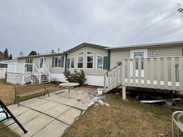 This meticulously maintained 3-bedroom, 2-bathroom home offers a spacious and inviting layout. The bright, open-concept living and kitchen area is enhanced by vaulted ceilings, two skylights, and expansive windows fitted with new Hunter Douglas custom blinds. Recent updates include new laminate flooring, lower cabinetry, countertops, backsplash, sleek stainless steel appliances, furnace and skirting. The kitchen is a chef’s dream, featuring a walk-in pantry and a built-in china cabinet. The oversized primary suite boasts a generous 4-piece ensuite and a walk-in closet. Two additional well-sized bedrooms are located at the front of the home, alongside a full bath. The large, well-maintained yard is fully fenced and showcases mature flower beds, creating a peaceful outdoor retreat. Both the front and back doors open to spacious decks, perfect for enjoying the sunny days in your private backyard. Located in a well-kept 40+ park, this home is conveniently close to shopping and transit—an ideal blend of comfort and convenience.