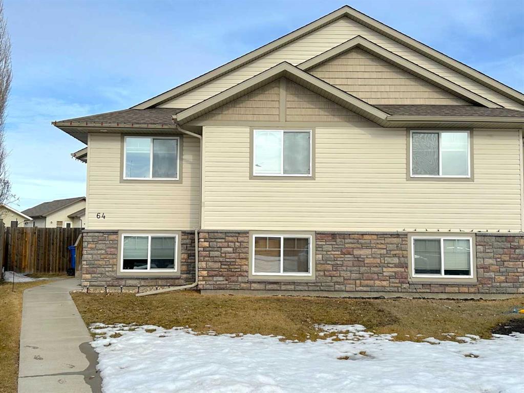 Welcome to 64 Heron Court, a stunning 5-bedroom, 3-bathroom half-duplex nestled on a peaceful cul-de-sac, complete with CENTRAL AIR CONDITIONING. This FULLY FINISHED home offers an open concept layout and a neutral color palette throughout. As you step inside, you’re greeted by a spacious entryway with soaring vaulted ceilings. The main floor boasts a modern kitchen featuring dark cabinetry, black appliances, a corner pantry, and a large eating bar. The dining room is generously sized and can easily accommodate a large table, while offering direct access to the expansive COVERED deck. The bright and airy living room is filled with natural light thanks to the abundance of windows. Down the hallway, you'll find a 4-piece main bathroom and two well-sized bedrooms, including the master bedroom, which comfortably fits a king-size bed. The master also includes a WALK-IN closet and a luxurious 4-piece ensuite. The fully finished basement welcomes you with a spacious family room, perfect for movie nights. Additionally, there is another 4-piece bathroom, extra storage space, laundry, and 3 more bedrooms, or turn one of them into an office/workout/crafts room. The in-floor heating has been roughed in for added convenience. Outside, the home sits on a large, fully fenced corner pie-shaped lot, offering ample additional parking, including gated RV parking, plus extra storage beneath the deck. Located in a quiet cul-de-sac, this home is close to schools, shopping, recreational facilities, biking trails, and more! It also offers quick access to the highway for easy commuting or weekend getaways. Don’t miss out – this beautiful property won’t last long!