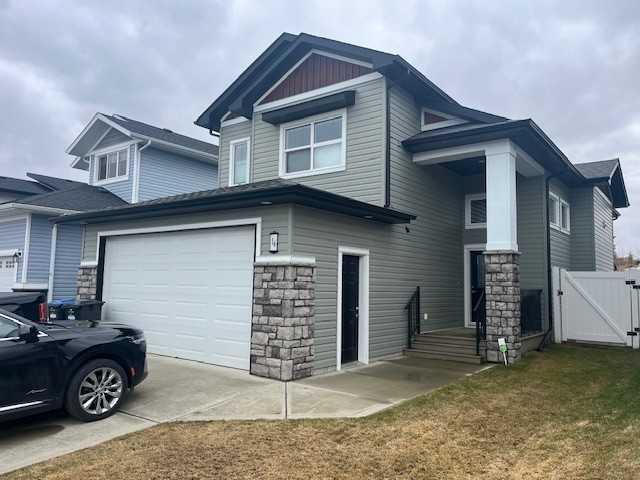 Elements of earthy tones grace the curb appeal of this gorgeous home. Nestled on a nice sized lot backing onto a greenspace in the new neighborhood of Crestview. Close to schools, parks, walking trails and with easy access to highway 11. The attached double garage is fully finished and heated! The large foyer gives a vantage point to all levels of this floor plan. A few steps up into the heart of the home and the main gathering areas. Lovely laminate flooring leads you throughout this level. The kitchen features rich dark cabinetry, stainless steel appliances, and gorgeous granite countertops. Vaulted ceilings and large windows offer an airy atmosphere. Dine inside or step thru the garden doors to lounge on the large deck. The warmth of the south facing backyard welcomes you outside. Fully fenced for the kids and pets to safely play. The expansive green space beyond gives you added peace and privacy. Back inside, two generous bedrooms and a 4-piece bathroom complete this main level plan. A few steps up to the private primary suite. A spacious retreat with a wonderful walk-in closet and 3-piece ensuite. The fully finished basement offers a fantastic family room. Cuddle up for movie nights with the added comfort of underfloor heating. Two more generous bedrooms and a 4-piece bathroom are perfect to accommodate older children or company. Laundry can be found on this lower floor, along with ample under-stair storage. Recent upgrades include a new hot water tank and irrigation system. This fantastic home offers a unique floor plan with versatility and functionality. The pictures don't do it justice, pick a time for your tour!!