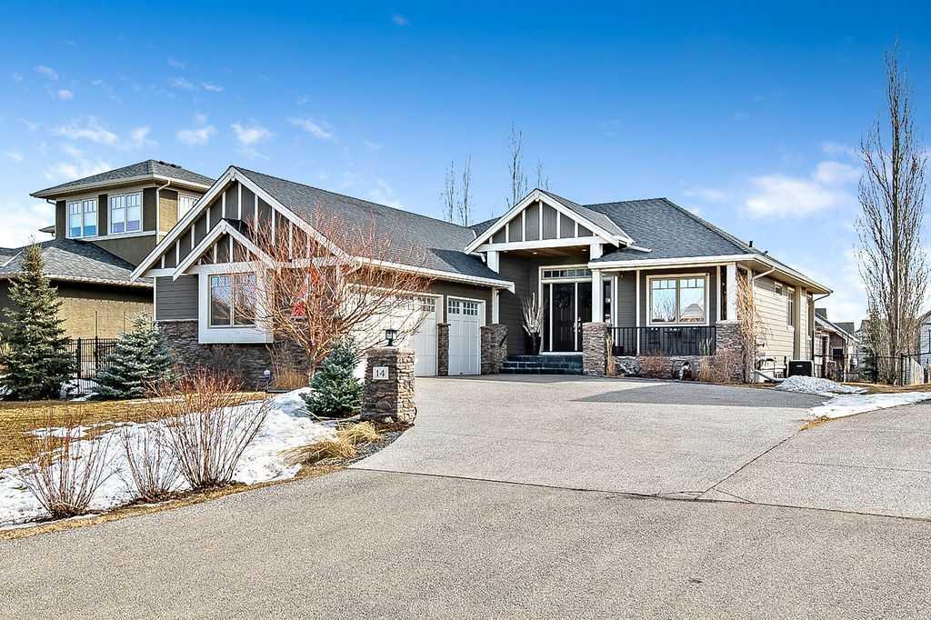 **Open House March 23 2-4pm** Welcome to 14 Cimarron Estate Links! Immaculate* Well Maintained* Custom built* Executive* Pride of Ownership* Tech Forward* Separate Entrance* Located in the prestigious area of Cimarron Estates this home is a showcase for quality workmanship and materials. You will feel at home the moment you walk up the steps to the slate covered porch with double doors and into this spacious entry. Greeted by curved staircase with iron railing, the detailing in the coffered ceiling, the floor to ceiling stone fireplace in the living room, beautiful hardwood floors, abundance of Natural Light and Windows. It immediately feels like a place you want to be! The chef's kitchen features a large island, top of the line appliances, lots of cupboards, large pantry and quartz countertops and a sunfilled dining area with access to the grand covered deck and backyard. The primary bedroom is a true retreat, featuring peaceful a 5 pc ensuite, huge walk-in closet & a cozy tranquil sitting area with fireplace to decompress after a long day or to curl up and read a book. Completing this floor there is a large second bedroom offering a window seat, full Bathroom, and a very functional Laundry room with lots of cabinetry and Quartz counters which is great for organization and storage. The basement has been professionally developed with in-floor heat, 2 large bedrooms with walk-in closets, recently upgraded bathroom with a shower, large full wet bar and massive games area. to enjoy family or cozy up to the sports game. There's a Gym and storage that leads to the separate entrance from the basement up into the triple attached garage which features in-floor heat lots and lots of built in storage, work bench and area for the handy person and all of your hobbies! Top this off with a solid wood doors throughout the interior, freshly landscaped yard that is well manicured featuring maturing trees, stone paved patio area with firepit over-sized shed complete with electrical plugs, a fenced dog run, sprinkler system along with A/C and Central Vac, custom window treatments. An added bonus is the phetera of tech in this home; cameras, smart lighting, govee lighting, smart thermostats and a sound systems. This is a very very well cared for home is in a private estate area and yet has quick access to all the amenities along with easy access to Calgary. There is an abundance of walking paths with access to walk by the river, ponds, shopping and schools to keep you very active. Everything has been thought of, maintained and done making this a turn key home all you will have to do is move in! Come and View then start Packing!
