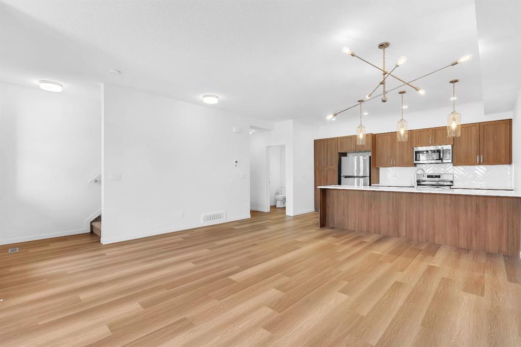UNBEATABLE VALUE AT $458,000 IN AIRDRIE! NO CONDO FEES | BRAND NEW | NEVER LIVED IN | BEDROOM-SIZED DEN | ATTACHED GARAGE | 1,533 SQ. FT. | WALKING DISTANCE TO SCHOOL | PRIME ACCESS TO DEERFOOT VIA 40TH AVE. Welcome to this stunning, never-occupied upgraded townhouse—a perfect blend of modern elegance and everyday convenience. Step into a spacious foyer that welcomes you with warmth and functionality.The open-concept main floor is designed for effortless entertaining, featuring a sleek quartz kitchen island, premium cabinetry, and high-end LVP flooring. A stylish chandelier illuminates the bright dining area, while the spacious living room flows seamlessly onto a COVERED BALCONY WITH A GAS LINE—IDEAL FOR YEAR-ROUND BBQs. A convenient powder room completes this level. Upstairs, the PRIMARY SUITE is a true retreat, offering HIS & HER CLOSETS and a SPA-INSPIRED ENSUITE with DUAL SINKS and a STANDING SHOWER. Another LARGE BEDROOM, a SECOND FULL BATH WITH DUAL SINKS, a BEDROOM-SIZED DEN, perfect for a home office, guest room, or flex space and a FRONT-LOAD LAUNDRY ROOM round out the upper level. Parking is a breeze with an OVERSIZED ATTACHED GARAGE, a FULL DRIVEWAY, and AMPLE STREET PARKING. Located just MINUTES FROM SCHOOLS, PARKS, SHOPPING, AND CROSSIRON MALL, with QUICK ACCESS TO DEERFOOT TRAIL and the FUTURE SOUTH POINT VILLAGE COMMERCIAL COMPLEX, this home is the ULTIMATE COMBINATION OF STYLE, FUNCTIONALITY, AND LOCATION. MOVE-IN READY—SCHEDULE YOUR SHOWING TODAY!