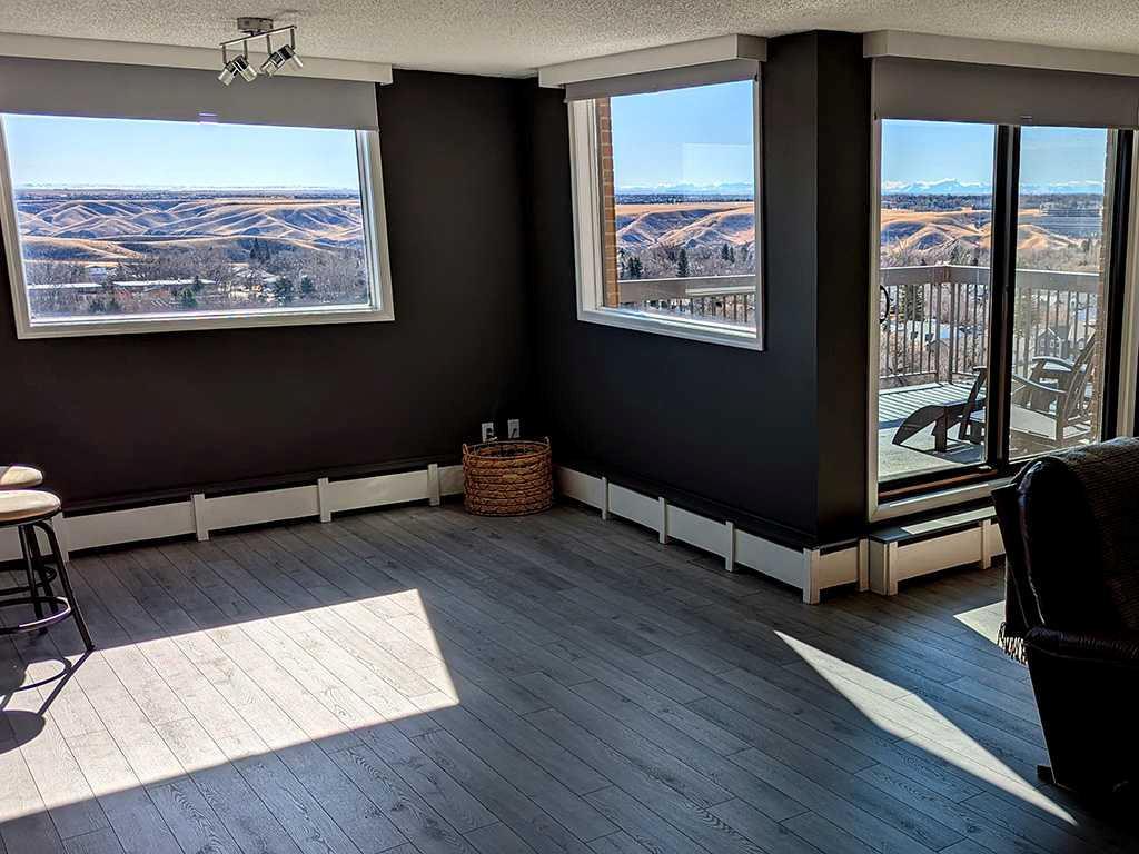 Discover vibrant downtown penthouse living in one of only four exclusive top-floor suites, offering over 1400 sqft of elegantly renovated space with breathtaking city, mountain, and coulee views—including the iconic High Level Bridge. This coveted SW corner unit boasts one of the highest balconies in the city, complete with a gas line for effortless BBQ gatherings. Inside, a spacious, light-filled interior features an updated kitchen, a brand-new gas fireplace, and a luxurious master bedroom with a large walk-in closet and an ensuite complete with a jetted tub. Enjoy the convenience of in-suite laundry—available exclusively in the penthouses—and two secured, covered parking stalls with direct elevator access right outside your door. Located within walking distance of the best restaurants, retail shops, Festival Square events, and key cultural spots like the downtown library, Yates Theatre, and live music venues, vibrant downtown living has never been more accessible. The building has recently undergone major mechanical upgrades, including upgraded boilers and AC chiller units, new elevators, and security enhancements completed in 2024, which add exceptional value and peace of mind.