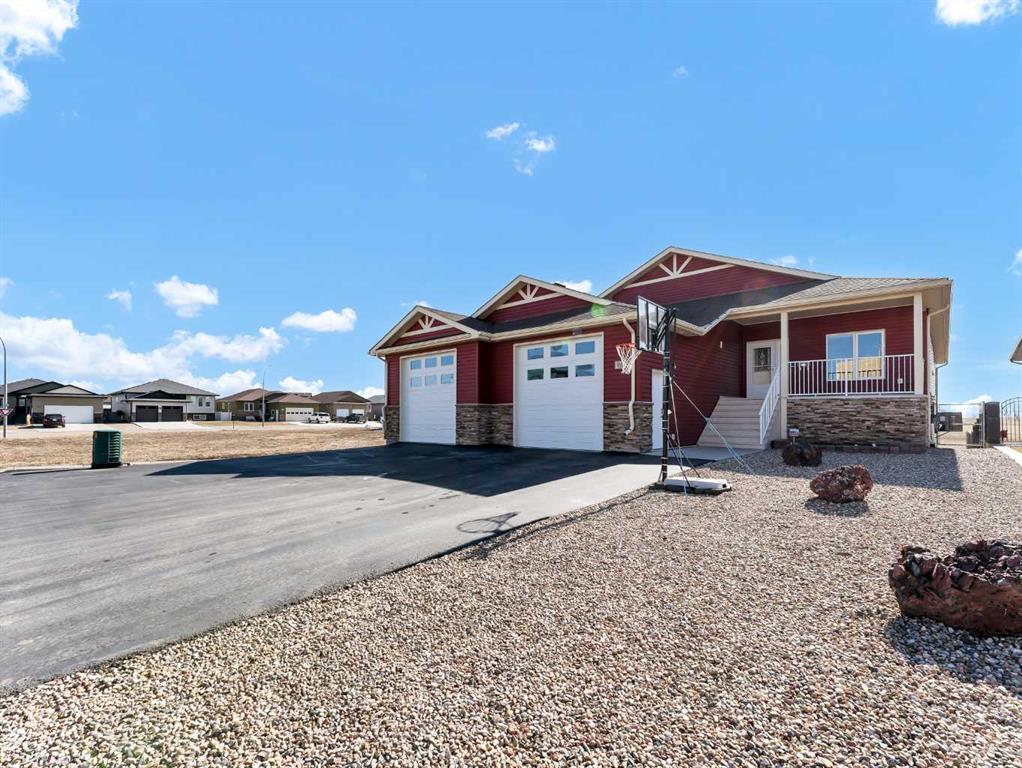Golf Course views - One owner Custom Built Bungalow nestled in the quiet cul-de-sac of Maskell place in Redcliff. This stunning 2016-built bungalow offers 2,441 sq. ft. of main floor living space, designed with luxury, accessibility, and functionality in mind. This 4-bedroom home is mobility-friendly, featuring extra-wide hallways and stairways, a wheelchair lift in the garage, and an interior stair lift for effortless access. The primary suite includes a mobility-friendly ensuite, ensuring comfort without compromising style. The expansive kitchen is a chef’s dream, complete with a large island with quartz countertops, a walk-in pantry, ample storage, and all appliances included. The dining area opens into a sunroom, offering breathtaking views of the fully landscaped backyard and golf course, with access to a covered deck perfect for outdoor enjoyment. The main floor laundry and inviting gas fireplace add to the home's practicality and warmth. The fully developed basement is designed for entertainment, featuring a wet bar, games room, pool table (included), and a dedicated hot tub room with additional enclosed storage. The oversized 32' x 40' heated garage provides ample space for vehicles, storage, or a workshop. The fenced yard is beautifully maintained with underground sprinklers and a storage shed for added convenience. Move-in ready with immediate possession available, this exceptional home is a must-see!