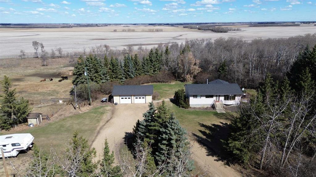One mile off pavement in a Great Location! This acreage has SPACE and NO NEIGHBOURS. House has been very well maintained with features newer shingles, and LARGE NEW DURADECK on East side of House. With the option of 5 bedrooms, or multi bedrooms and an office and/or workout room, you have the space. The large back Entry which is the main entrance, features a 2 pce bathroom, laundry, and access to the basement. The main floor has a nice flow to it, with the friendly kitchen you have an open dining room to the living room. The new deck is just off the dining room. Upstairs you also have the three bedrooms and full bath. The basement has an additional Family room and two more bedrooms. Under the entrance is your cold storage room/additional storage. Outside you have a GORGEOUS PRIVATE yard, with a nice welcoming driveway which leads you to your 32'x24' heated garage with metal siding. There are a couple pens on West side of acreage with one waterer for the animals. The acreage is nicely treed! Your private drilled water well has ample amounts of water.