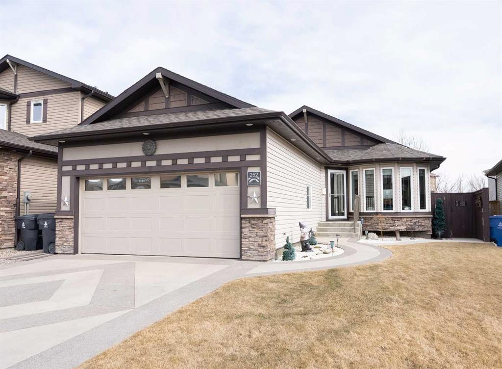 Experience luxury living in this beautifully designed former show home in Riverstone! This well thought out bungalow offers high-quality finishes and a well-designed floor plan, making it ideal for comfortable and stylish living. The main floor features both granite and concrete countertops, stainless steel appliances, and a gas fireplace, creating a warm and inviting atmosphere. Natural light floods the space through four skylights, enhancing the open-concept design. The primary suite offers a private retreat with an en-suite bath and large walk-in closet. The fully developed basement expands your living space with additional bedrooms, a large family room, a 2nd gas fireplace, and abundant natural light. Stay cool in the summer with central air conditioning. Step outside to a beautifully landscaped, low-maintenance yard featuring a cross-fenced private space and a sheltered east-facing deck, perfect for morning coffee or evening relaxation. This home is a rare find in today’s market — combining luxury, function, and comfort. You won't want to miss this one! Call your Realtor® today to schedule your private tour!