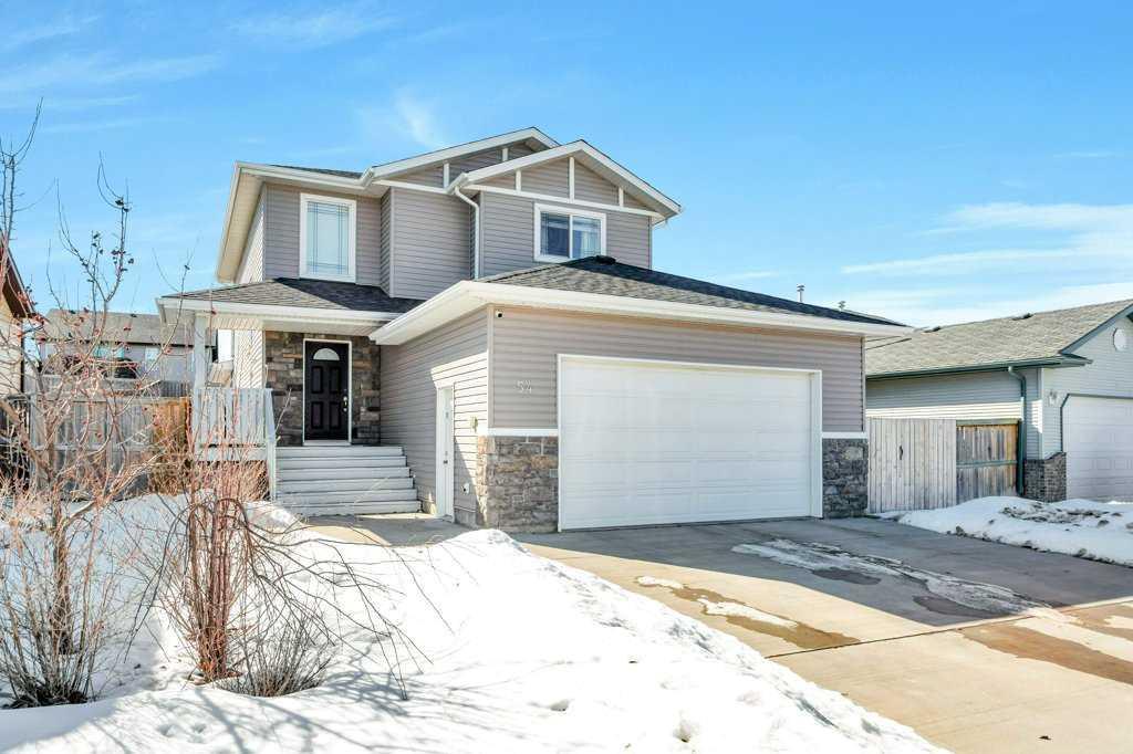 Great family home in Blackfalds!! This fully developed 2 storey is a perfect layout for a growing family, there are a total of 4 large bedrooms (3 up, 1 down), and 4 baths including the beautiful master bedroom ensuite with a tiled shower and jetted tub!! A double attached garage takes care of parking and a large covered front veranda welcomes you to the bright, open concept main level. The living room features a large south facing picture window overlooking the backyard and a gas fireplace with mantle and tile surround. The kitchen offers a functional layout with a huge center island, ample medium stained oak cabinets, pots and pan drawers, built in wine rack, crown mouldings, stainless steel appliances and pantry. The connected dining space with garden door access to the covered deck and backyard provides easy access for evening BBQ's. There is a 2 piece main floor bath, main floor laundry is located just off the attached garage and offers built in cabinets providing tons of storage. The upper level is home to the main bedroom can easily accommodate a king bed plus multiple pieces of furniture, has a walk in closet with built in shelving and a spa like ensuite with a raised vanity, jetted tub and separate shower with tiled surround. 2 additional bedrooms located on the same level as the primary bedroom are both a generous size and share a 4 piece bath with tiled shower surround. The fully finished basement has roughed in floor heat, and offers a large rec room, 4th bedroom, 3 piece bathroom and space for storage Other great features of this fine home include; central vacuum, central air conditioning, new washer and dryer in 2022, new shingles in 2023 and new hot water tank in 2024, plus a 22x24 garage with shelving. The backyard is fully fenced with gas line to deck and separate dog run, RV parking along with back alley access and a great play house for the kids! Located directly across from a walking path that leads to Centennial Park with wetlands and walking trails, with easy access to shopping and schools.