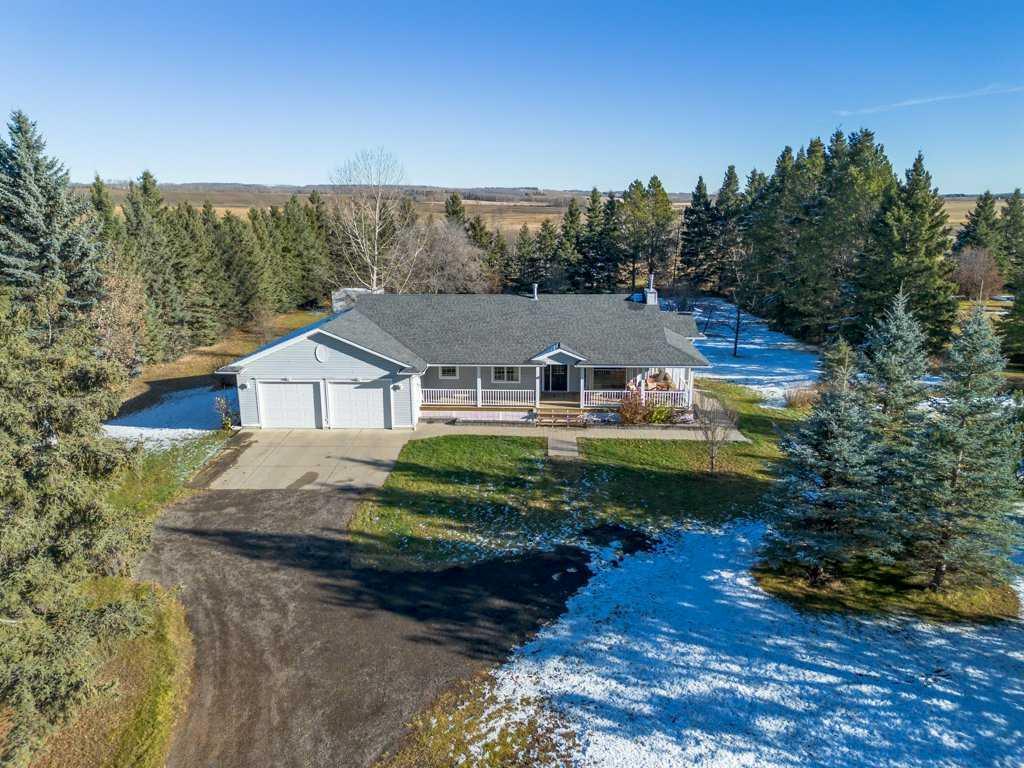 This fully developed bungalow offers incredible views and sits on 16.16 acres of land and offers peaceful and quiet living found just minutes from Leslieville. Walk in the spacious entrance and enjoy the open floor plan with the large living area that captures magnificent views. The kitchen offers beautiful cabinets with lot of counter space and is open to the dining and living areas, making this a great space to entertain your friends or spend time with the family. The main floor has three bedrooms (or two bedrooms and an office), with main floor laundry off the garage. The home has an abundance of large windows that not only provide exceptional views, but allow for sunlight to soar through the home, making it a bright and sunny space. The lower level offers a large recreation / family room, two extra large bedrooms, full bathroom, in-floor heat, and storage, making this a great space for teenagers and/or guests. It is a great family home, bring horses and other animals. The property is landscaped with lots of trees and is located at the junction of Hwy 761 and Rainy Creek Road, so no gravel.