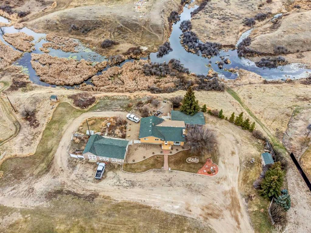 Welcome to your new quiet county lifestyle! This 2.52 acre acreage is just 4 minutes down the #3 highway from the last traffic lights in Medicine Hat, and is the perfect mix of land, house, garage(s)/vehicle storage spots, with coulee views, and an un-obstructed view of Seven Persons creek winding behind the home! This tranquil acreage will melt your stress away from the noisy city at an affordable price. With city power and utilities that cost the same or less vs. being in the city, but bonus-your property taxes are Half of what they would be in the city for a similar priced home! This solid 1370 sq ft 3 level split brick home features on upper level: 2 bedrooms, 3pc. ensuite off master, a den/sitting area and full 4 pc bath with laundry conveniently located near bedrooms! Main floor home to open kitchen & dining room, and living room with a wood burning fireplace, with access to side patio and attached large heated garage. 3rd level has the 3rd bedroom and storage/utility area with cistern/pump for fresh water. City power, Apex natural gas, these 2 average total $350ish per month, the low maintenance septic field just needs just a $100ish service once/year. Water is currently hauled from Med Hat by owners choice, (a whopping $2 per load cost) truck and haul tank negotiable in sale! Bonus- the water co-op hook-up is in the yard and can be hooked up (fees already paid) to save hauling, for $600/yr +plus metered usage, there is also a well, that was been abandoned for many years so would take some work & exploring to revive if buyer chooses (well water is hard thus why they don't use it), so good options for water! For your hobbies and/or vehicles there is a large attached 37'x20' heated garage right off the backside of house, plus an older 43'x25' 3 car barn-style storage garage for you toys/storage space. Back yard has a pond and will be a great private spot to relax and take in your new view on those warm sunny days. Full appliance package includes: Fridge, stove, dishwasher, microwave, washer, dryer, as well as central air, central vacuum, as well as a high efficient furnace! Home could use some fresh paint like any house, but is priced accordingly and is arguably the Best Value on the market for an acreage this close to the city! 5.8 kms from last traffic light, follow signs. Brand new RPR & compliance included. The spring market is upon us, so make your appointment to see it soon!