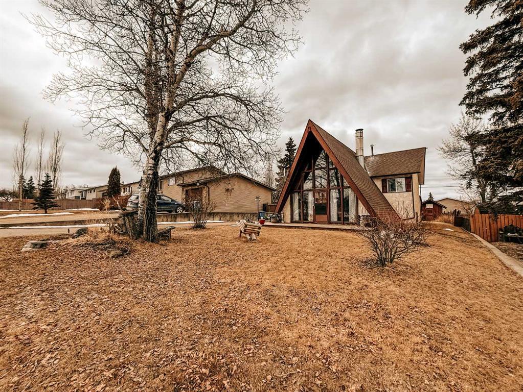 This unique A-frame, 3 level split home, has distinctive architectural design and an inviting outdoor space with mature trees, perennial gardens and high fencing for privacy. An outdoor patio, indoor sauna and an enclosed back porch/sunroom are ready to greet you with a warm welcome; get ready to relax at the beginning or end of your day; or both! This home has 4 bedrooms and 2 bathrooms. The main level is the living room located in the A Frame; vaulted ceilings, a cozy wood fireplace with hearth and lots of natural light, with East facing windows. Upstairs, the dinning room fits your family table and hutch. The kitchen has a breakfast island and butcher block counter for food prep or rising some cinnamon buns! Down the hall 2 good sized bedrooms and a main bathroom with tub/shower combo. Downstairs, the family room with sauna and wet bar, two more bedrooms and utility room with laundry and 3pc bathroom w/shower. This home has storage!! The bookcases double as doors to storage under the A Frame too. The home has never had any water issues; a safe and secure investment. Outside, the large and long paved driveway fits your RV or camper. The back yard is perfect for entertaining and also has a garden shed and gate to the back lane. If you are seeking a charming and character-filled property, this is it!