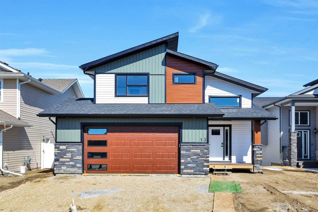 Welcome to 13 Maclean Close, a 1477 sqft modified bi-level home built by Manhani Builders in the neighbourhood of McKay Ranch, Blackfalds. Carefully crafted for comfort living, it boasts a desirable location near trails and parks. The open layout, tall vaulted ceiling, and thoughtful design elements create a stylish living experience. Highlights include a grand entrance, stained maple railing, main floor laundry, feature walls, upgraded carpeting, vinyl flooring, and large windows that fill the home with natural light. The kitchen features a mix of painted and stained maple cabinets, quartz countertops, and upgraded stainless steel appliance package. The master bedroom offers privacy with a walk-in closet and ensuite. The 24x24 garage accommodates two vehicles comfortably, and the exterior blends vinyl, stone, window trims, and wood grain paneling. Enjoy outdoor spaces with a composite front porch and a 12'x10' treated wood back deck. Additional features include MDF painted shelves, roughed-in garage heater, walk-out basement, roughed-in floor heating, and potential for future basement development. A high-efficiency furnace and HRV System which ensures clean air and comfortable temperature throughout the home. Please note that the driveway, front stairs, parging, and front yard landscaping is pending and will be completed in the spring. Interior is completed and it is ready for possession. Welcome to 13 Maclean Close, where comfortable living meets modern charm.