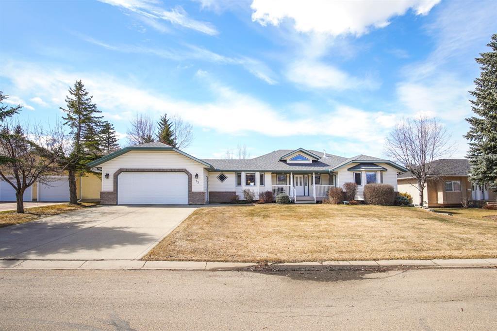 Welcome to 53 Coventry Lane, Lacombe, Alberta. Nestled in the desirable English Estates, this beautifully maintained 1,700 sq ft bungalow offers the perfect blend of comfort, privacy, and convenience — all on a generous .36-acre lot with TWO garages. Pride of ownership shines in this original-owner home, thoughtfully designed for easy main-floor living. Inside, you’ll find two spacious bedrooms and 1.5 bathrooms on the main level, including laundry conveniently just steps from the primary suite. The living room is warm and inviting with its vaulted ceilings, gas fireplace, and plenty of natural light. The kitchen features granite countertops, white cabinetry, hardwood flooring, and a cozy breakfast nook — plus a formal dining room that opens onto a generous west-facing deck, perfect for evening sunsets. The primary bedroom is large and bright, with the main bathroom just next door offering both a jet tub and separate shower. The attached double garage leads into a practical mudroom with ample storage space for coats and shoes. Downstairs, the fully finished basement offers incredible space with three additional bedrooms, a full 4-piece bathroom, a large recreation room, and cold storage areas for all of your extras. Outside, enjoy the peaceful, park-like backyard with two garden areas, underground sprinklers, and a 23x23 heated detached garage — currently used as a workshop. This space is ideal for hobbyists, extra parking, or future projects. Recent updates include: Newer furnace & hot water tank, All Poly-B plumbing replaced, newer shingles, Brand new A/C, and more! Located in a quiet, mature neighbourhood filled with beautiful trees, 53 Coventry Lane feels like acreage living right in town — just minutes from everything you need. Don't miss your chance to make this special home your own!