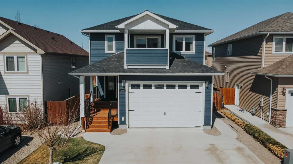 This lovely five bedroom, four bathroom family home is one you need to see! Large, beautiful and practical. Huge, welcoming, family friendly entrance. The living room has 2 full storeys of open height, towering windows, and a corner fireplace that all contribute to the home's grand feel. Plenty of light in the dining room with windows on 3 sides, & access to the sheltered deck which is perfect for BBQing. The primary bedroom is very spacious with a 5 piece ensuite (his/her sinks & jetted tub), walk-in closet with natural light, and its own private balcony for relaxation. Fully finished basement with good size windows. Main floor laundry with sink and cabinetry, conveniently by the garage entry. This home also features a heated and finished double garage with 9 foot tall vehicle door. Tremendous construction/energy details with ICF foundation and energy efficient furnace and hot water tank. New Hardie board siding and shingles in 2023. The front entry, upstairs balcony, and back deck are all covered for your weather protection. Only a few house's walk to the Nobleford Spray Park! Great family friendly town of Nobleford with low taxes and a short drive to Lethbridge.