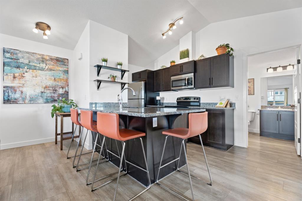 Welcome to this upper-level stacked bungalow-style townhouse in the sought-after Chinook Crossing complex in Airdrie. This beautifully maintained home offers the perfect blend of modern charm and low-maintenance living, complete with your own west-facing balcony and assigned parking stall. Nestled in a professionally managed complex, you’ll love the convenience of being within walking distance to some of Airdrie’s best amenities—including schools, parks, the splash park, and miles of scenic walking paths. Step inside and head upstairs to an inviting open-concept living space filled with natural light and freshly painted. The spacious living room features high ceilings and large windows that flood the area with sunshine, creating a warm and welcoming atmosphere. It flows seamlessly into the dining area and a well-equipped kitchen that boasts granite countertops, stainless steel appliances, a corner pantry, and a large eat-up island—perfect for casual dining and entertaining. Enjoy your private, west-facing deck—ideal for unwinding after a long day or hosting friends for an evening barbecue. The unit also includes 2 bedrooms and a 4-piece bathroom complete with a relaxing soaker tub/shower combo, and a convenient in-suite laundry area discreetly tucked within the bathroom for added functionality. As part of a professionally managed complex, residents benefit from a worry-free, low-maintenance lifestyle—leaving you more time to enjoy everything this vibrant Airdrie community has to offer.