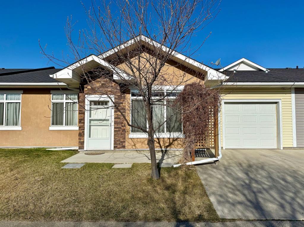 This home ticks many boxes whether you are looking for a community to live in year round or just need a lock-n-leave property to head somewhere warm for the winter! Walking in, there is an open concept dining, living, and kitchen area with a huge vaulted ceiling. To the right, is the single attached garage along with the laundry room. To the left, there is a den with built in cabinetry and 2 bedrooms. The primary bathroom has a large walk-in closet and has a cheater door to the 4 piece bathroom. Come take a look today!