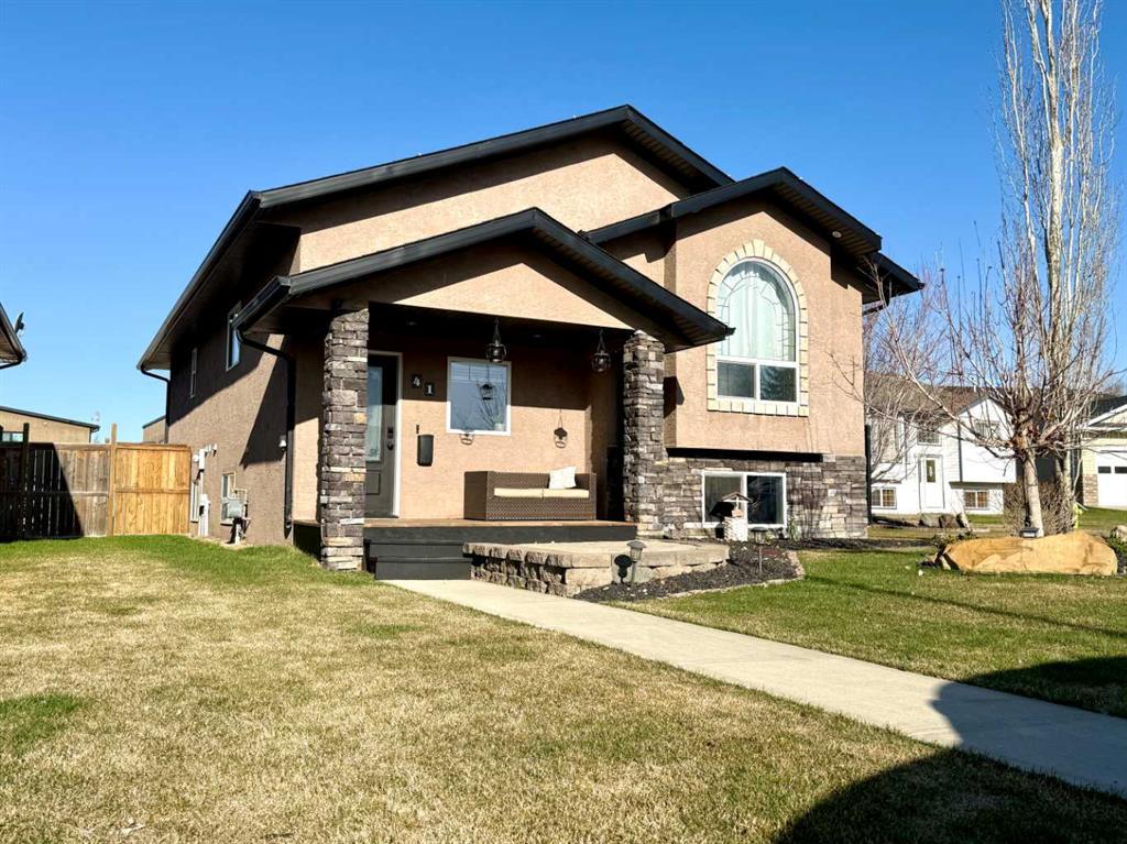 FULLY FINISHED 1,197 SQ FT, 4BED/ 3BATH HOME! Featuring at TRENDY-LOOKING BI-LEVEL, situated on a KEY-HOLE CLOSE, stucco exterior and gorgeous front deck, overlooking a tastefully manicured garden with perennials & Shrubs. Bright & open design, with a welcoming entryway, the main floor features is wide open to the living/ dinning and kitchen area, dawned with vaulted ceilings, a breakfast bar, oak cabinets and stainless steel appliances, with pantry space. The spacious primary bedroom features a 3pc ensuite, generous closet, along with an another big bedroom and full bath that finishes off the main floor. Stay cool this year with it's CENTRAL AC throughout the home, and enjoy the Summer evenings off the West-facing covered deck off the kitchen area for BBQ'ing! The perfect addition to this fully landscaped & fenced EXTENDED 120' deep lot, which is fenced for a dog-run already, storage shed and parking for numerous vehicles, ensuring you have plenty of room to build a MASSIVE GARAGE at the back. The fully permitted & inspected, finished basement features two additional spacious bedrooms, a recently completed 3-Piece bath, a stylish barn door-enclosed flex room, for either a bar(already plumbed in, a theatre room, or home office) and laundry/ mechanical room, is the perfect set up for your next move into Blackfalds. Central Vac, storage shed and all appliances come with.