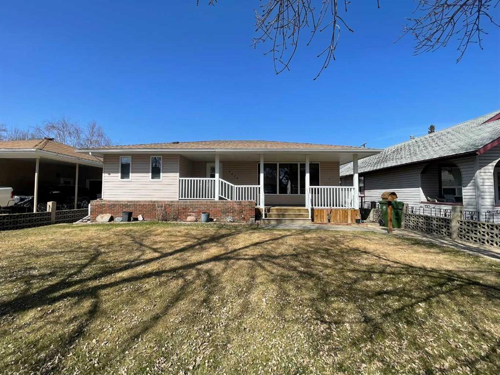 Welcome Home! This lovely, central Lloydminster bungalow has been lovingly maintained by its current family for many, many years. Today, this home is seeking new owners to make it their own. A well treed neighbourhood with an excellent walk-score to central services and the downtown area; the surrounding homes all show pride of ownership. Some of the quality updates to mention include shingles, windows, vinyl siding, flooring and furnaces. You are sure to enjoy the covered front veranda as much as the seller has as even with central A/C this wonderful feature also conveniently keeps the south heat from getting into your living space! The property presents, not only with ‘good bones’ but with great curb appeal, nicely landscaped front and back with a concrete side walkway and a fully fenced rear yard, a wooden patio area, dedicated sun-filled garden and alley access to a double detached garage. Inside you are welcomed to a partially open concept plan to the living room and a spacious eat in kitchen with oak cabinetry and an included appliance package. There are nice storage options on the main as well as two comfortable sized bedrooms and a four-piece bathroom; notice that there is even a unique skinny storage space available at the end of the tub! Both the front and rear entry ways are large enough to welcome in guests and to store away coats and bags, the back entry provides direct access to the basement mother-in-law suite. The downstairs has several very large windows for this age of a home and features two bedrooms, kitchenette, family room, den, four-piece bath and laundry/utility area with additional storage opportunities. (OMIT all main floor curtains from any offers please) Make your move!
