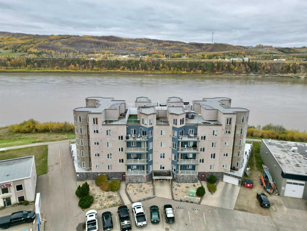 Safe, secure, peaceful and carefree riverside living! The sentence sums up what life can be like in this top floor condo with fantastic views of the Mighty Peace! Unique in its design, it is a two storey unit that offers an upper floor loft that still takes in the great views and it also gives you access to your very private rooftop patio. The main floor provides you another deck so outdoor living is easy here. There are two bedrooms and two bathrooms and an open concept main living space with soaring ceilings to give you a great sense of roominess. Another nice touch is a corner gas fireplace for you to enjoy on a chilly winter evening. There is also your own private in suite laundry making that household chore that much easier. Secure underground parking is another unique feature for this condo that many other condo buildings in Peace River do not offer. And all of this has the grounds and snow removal taken care of so you can simply live your best life! A beautiful waterfront property with amazing views! It doesn't get any better than this so call today to book your private viewing!
