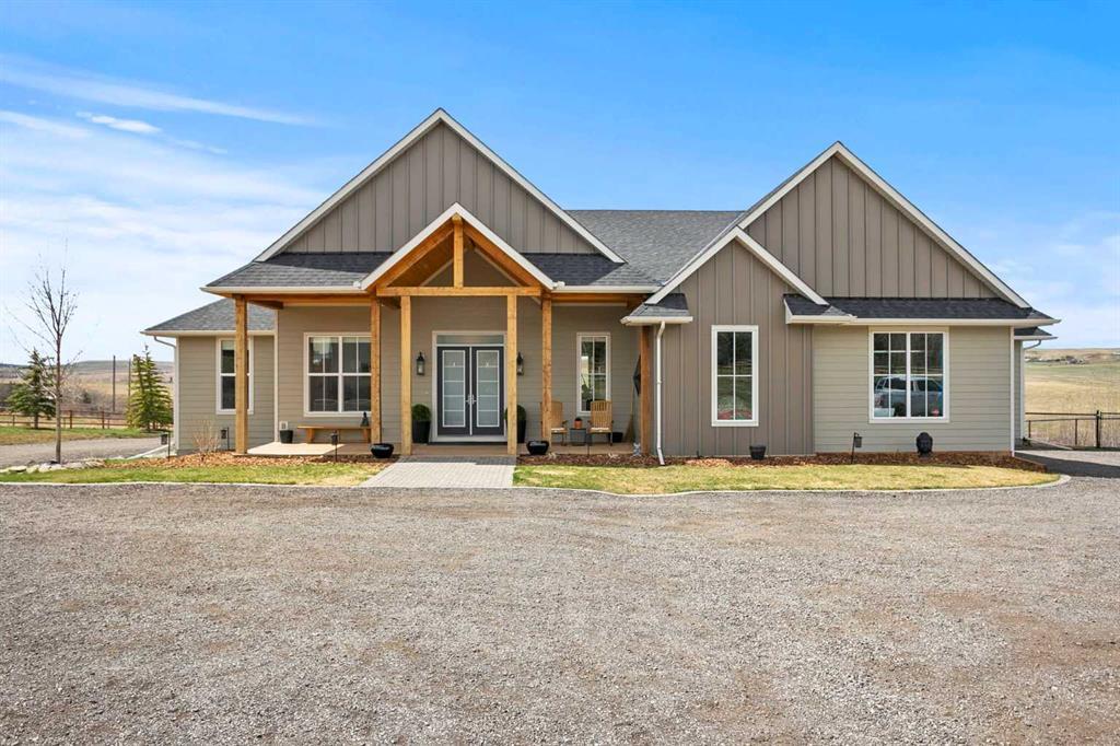 Discover this stunning custom-built walkout bungalow, almost new and nestled on 2.67 acres just 10 minutes south of Okotoks, offering breathtaking mountain views. With over 4,900 square feet of thoughtfully designed living space, this impressive residence includes a spacious 1,216 sq ft oversized triple garage and a 42 x 32 ft heated shop. Built with an emphasis on energy efficiency, it boasts an ICF block foundation and SIP walls, ensuring optimal performance. As you step inside, you're greeted by panoramic mountain vistas and an abundance of natural light pouring in through large windows. The home features exquisite engineered hardwood flooring, soaring 10 ft ceilings, and 8 ft solid core doors throughout. The chef's dream kitchen is equipped with extended height cabinets, a built-in wall oven, a butler's pantry, a farmhouse sink, quartz countertops, and a massive island complete with a wine fridge. The spacious living room, with its stunning views, showcases a beautiful fireplace adorned with stacked stone and a wooden mantle. Perfect for entertaining, the expansive dining room opens up to a low-maintenance 42.5 x 12 ft deck, ideal for barbecuing while enjoying spectacular sunsets. A well-appointed office with built-in shelving provides a perfect workspace at home. Retreat to the impressive master suite, featuring captivating views and direct access to the deck. The luxurious ensuite includes a wet room with a shower and tub, dual vanities with quartz countertops, and a huge walk-in closet. On the opposite side of the home, you'll find two generous bedrooms and a stylish family bathroom with a standalone tub, oversized tiled shower, and double vanity. Completing the main level is a convenient half bath and a laundry/mudroom adorned with a chic tiled floor, built-in lockers, and a laundry sink with quartz counter. The fully finished walkout basement, with in-floor heating (each room has its own thermostat), offers a massive family/games room perfect for entertaining, a wet bar, a golf simulator, a home gym, and a large flex room that can be customized as a theater, gym, or additional bedroom. Two additional bedrooms with plush upgraded carpeting and a bathroom featuring an impressive tiled shower and dual sinks round out this level. Step outside to the future brick patio to soak in the stunning west-facing views. Additional features include ample storage, a well producing 4 gpm, and a 380-gallon cistern. The expansive triple garage is roughed in for heaters and features oversized doors, with the longest bay measuring 27.5 ft. The heated shop, equipped with two oversized automatic doors, a covered entry, and plenty of electrical outlets, also includes a concrete floor and a four-piece bathroom with laundry rough-in. Call your favourite realtor for a showing today!