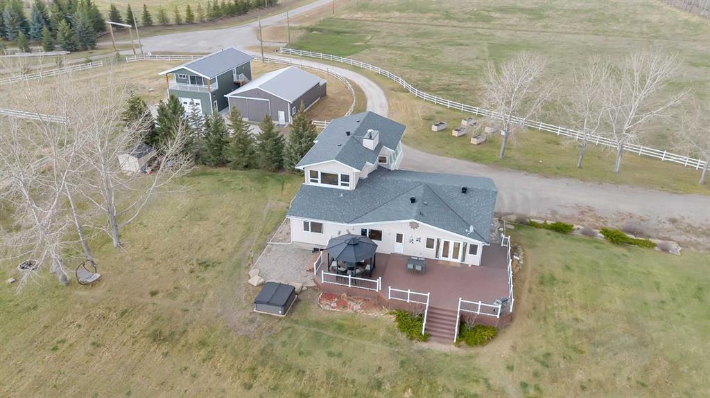 This lovely acreage has it all!! Unmatched panoramic views in every direction—majestic mountains to the west, rolling prairie landscapes to the east, and the charming town of Okotoks to the north—serve as the backdrop for this exceptional 6-acre estate nestled on a private cul-de-sac just five minutes south of Okotoks. The beautifully landscaped yard features fenced horse paddock, and ample space for outdoor living, making it perfect for equestrians, hobbyists, or those seeking tranquility and space. The charming one-and-a-half story home has been thoughtfully updated over the years, offering a bright, open-concept main floor with large windows that showcase stunning vistas, a cozy wood-burning fireplace, and a stunning kitchen with cream cabinetry, an oversized granite island, and surrounding windows to enjoy the view from every angle. The main level includes two bedrooms, a guest bath, 4 piece family bath, a private two-piece en suite and main floor laundry! A gorgeous spiral staircase leads to an upper loft/bonus room with its own balcony —ideal as a primary bedroom with en suite, yoga studio, or lounge area. The spacious Fully finished basement provides two additional bedrooms, a three-piece bath, and a large recreation room with gas fireplace, all enhanced by new carpeting and fresh paint. Step outside onto the gorgeous wraparound composite deck with maintenance-free railings, a natural gas line for BBQ and fire table and HOT TUB, perfect for outdoor entertaining. The property boasts impressive outbuildings, including a barn with two horse stalls, a dedicated tack room, rubber matting, interior metal roof, power, ceiling lighting, heating, and water, as well as a massive 48x24-foot workshop built in 2023, divided into two 450-square-foot bays with 220vt power, heating, and floor drains—ideal for projects, extra parking, storage, or a home-based business. Above the workshop is nearly 1,000 sq. ft.-extended family accommodation with open floor plan, east-facing balcony to enjoy the serene surroundings, one large bedroom, and a three-piece bathroom, a thoughtful perk for visitors! That’s not all, all big ticket items have been updated, New Furnace and A/C in 2021 and all poly b plumbing has been replaced. This property truly combines breathtaking scenery, versatile living spaces, modern outbuildings, and a peaceful rural setting, offering an unparalleled opportunity to enjoy both nature and comfort—schedule your private tour today!