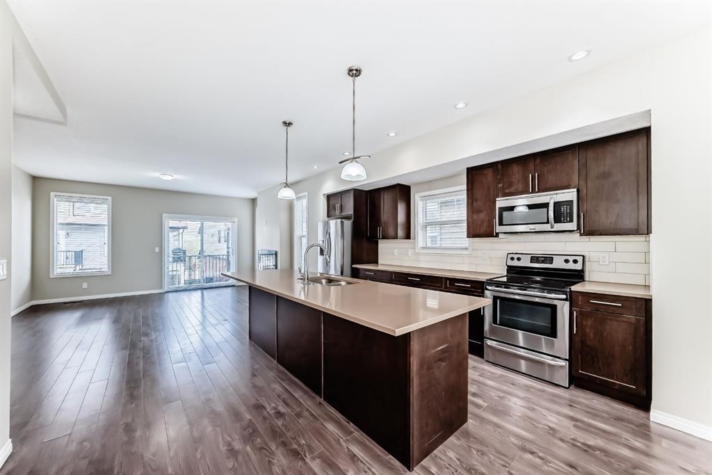 Stunning 3 Bed, 4 Bath Townhome with Double Attached Garage in the Williamstown Community. This beautifully designed 3-bedroom, 4-bathroom end-unit townhome, located in the sought-after Williamstown Community, offers modern living with ample parking. Featuring a double attached garage and an additional covered parking pad for one more car, this home provides a total of 4 parking spaces—perfect for families or those with multiple vehicles. Located in a family-friendly neighbourhood within walking distance to schools, this townhome is ideal for first-time buyers or investors. The community also offers ample visitor parking spots for guests. Upon entering, you'll discover a versatile flex room, perfect for additional office space, a gym, or extra guest accommodations. The full 3-piece bathroom, with a stand-up glass shower, is conveniently located on this level, alongside ample storage and access to the double attached garage. The second floor boasts a chef's kitchen with a spacious quartz island that comfortably seats four, complemented by top-tier stainless steel appliances. The bright living room features an electric fireplace and sliding glass doors that open to a private deck with a natural gas hookup—ideal for outdoor dining and relaxation. A spacious eating area with south-facing windows allows for abundant natural light, while a powder room adds convenience on this level. On the third floor, the expansive master suite offers a luxurious ensuite with stylish quartz countertops, double sinks, a large glass shower, and a walk-in closet. The floor also includes two additional spacious bedrooms, a main bathroom, and a laundry closet, making everyday living easier and more efficient.