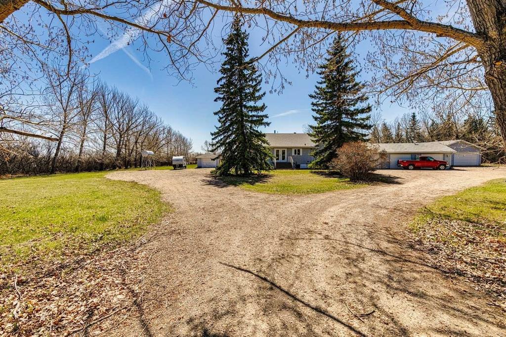 Welcome to this extraordinary 4-acre property tucked into a quiet cul-de-sac in the desirable community of Dry Creek Bay SW, Airdrie. Offering the perfect blend of peaceful country living and city convenience, this home offers heritage charm, modern functionality, and incredible outbuilding infrastructure—all within Airdrie’s city limits. Originally built in 1947 and moved onto the current site in 1976, the home has been lovingly maintained and updated over the years. It features over 3,000 sq ft of total living space, including 4 bedrooms and 2 full bathrooms. Heritage details such as crown molding, curved plaster walls, hardwood floors, and large windows blend beautifully with thoughtful upgrades throughout. The main floor offers 2 bedrooms, including a primary suite with a custom-built walk-in closet, and a renovated 4-piece bathroom with a walk-in tiled shower and a charming laundry chute. The kitchen is warm and inviting, with solid wood cabinetry, a vaulted ceiling, corner pantry, built-in wall oven, and a window over the sink that overlooks the picturesque yard. A spacious addition connects the home to the triple attached garage is a large family room with cohesive hardwood flooring, high ceilings, bright windows, and garden doors that lead to the expansive patio and yard. The fully finished basement adds two more bedrooms, a cozy family room, and a full retro-style bathroom, creating a comfortable and flexible space for family or guests. The home is air-conditioned and offers comfort year-round. Outdoors, the mature yard has been lovingly landscaped with flower gardens, stone pathways, peaceful sitting areas, established trees, and lush greenery, offering unmatched privacy and tranquility. The entire property is bordered by mature trees, giving it the feel of a true retreat while still offering quick access to all of Airdrie’s amenities. For those who value workspace, hobbies, or home-based business potential, this property offers exceptional outbuildings. The massive 53' x 30' shop is fully finished and equipped with HVAC, plumbing including its own bathroom, a dedicated electrical panel, 220V power, air conditioning, heat, and plumbed-in compressor lines. The triple attached garage is also heated and air-conditioned, with a dedicated electrical panel, 220V, and compressor lines. A detached single garage with its own panel along with several storage sheds offer even more flexibility for your equipment, hobbies, or tools. This is truly a rare opportunity to own a one-of-a-kind acreage property within the city limits. Whether you’re seeking peaceful living, room to grow, or space for all of those dream projects 23 Dry Creek Bay SW offers it all. Book your private showing today and experience the charm, space, and potential of this incredible property.