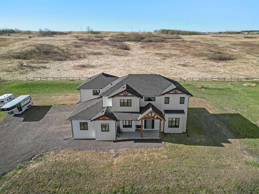 Stunning & Classy Family Farmhouse with Breathtaking Mountain Views Experience the perfect blend of elegance and comfort in this exceptional 3,700+ sq. ft. family farmhouse, set on 3 acres of cleared land—ideal for kids to play and explore. Located just 5 minutes west of Okotoks on paved roads, this home offers unparalleled mountain views from its west-facing windows. Step inside to discover a thoughtfully designed space featuring an open metal-railed staircase and a chef’s dream kitchen with sleek white cabinetry, waterfall granite countertops, and premium stainless steel appliances. A sliding barn door reveals a spacious pantry, while the massive mudroom leads to both the garage and backyard. Warm and invitiing great room boasts electric fireplace and huge picture windows facing those awesome mountain views. A dedicated home office and stylish powder room complete the main level. Upstairs, you’ll find four spacious bedrooms, including a luxurious primary suite with stunning mountain views, an electric fireplace feature wall, a massive walk-through closet, and a spa-inspired ensuite. Two additional full bathrooms, an extra laundry area, and a bonus room make this floor perfect for a growing family. The fully finished lower level offers even more space, boasting a huge recreation room, a full bath, an extra bedroom, and ample storage. For those who love garage space, the heated and drywalled 4-CAR GARAGE with 8-foot doors provides plenty of room for vehicles, tools, and toys. This immaculate home and property provide the best of modern farmhouse living with unbeatable views and space to roam—all within minutes of town. Don’t miss this rare opportunity!