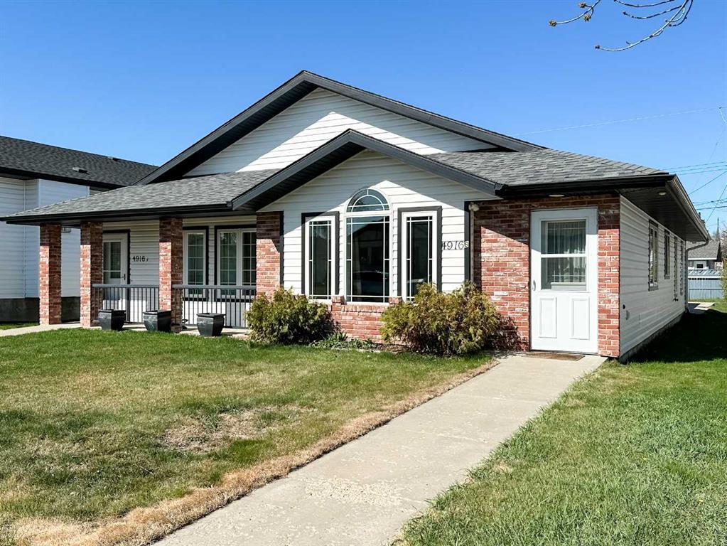ATTENTION SENIORS OR COUPLES – Two bedroom ½ duplex, no basement, conveniently located walking distance to main street Stettler for shopping, post office and the banks. The open concept living area is light and bright showcasing white cabinets. The primary bedroom has a walk in closet with shelving also for convenience and two closets in the hallway for ample storage. Main floor laundry. The outdoors, features a concrete patio and attached garage 13’ x 26’ and an extra parking spot.