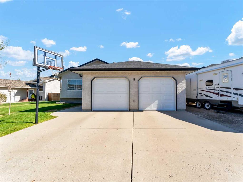 Fully developed 1477 SF bungalow located on a quiet cul-de-sac. This home has a nice view and is located close to Hole #5 on the Redcliff Riverview Golf Course. The main floor features 3 bedrooms, 4 piece bathroom, a beautiful kitchen with breakfast bar island and stainless steel appliances, dining area and spacious living room. New vinyl plank flooring has been installed in the living room and hallways. Just off the dining room, is access to the covered deck. The back deck leads down to the concrete patio which was poured in 2019. The yard is totally fenced with underground sprinklers. The master bedroom boasts vaulted ceilings, a large walk-in closet and a 4 piece ensuite. Also conveniently located on the main floor is the laundry room. Downstairs includes a huge family room, 3 additional bedrooms and a 4 piece bathroom. The basement bathroom was totally redone in 2024. There is a new hot water tank and the AC unit was replaced in 2024. The attached 24x24 heated garage has plenty of room for two vehicles and more with RV parking at the side of the garage. Two new belt driven garage doors have just be installed. Great family home. Call for your private viewing today