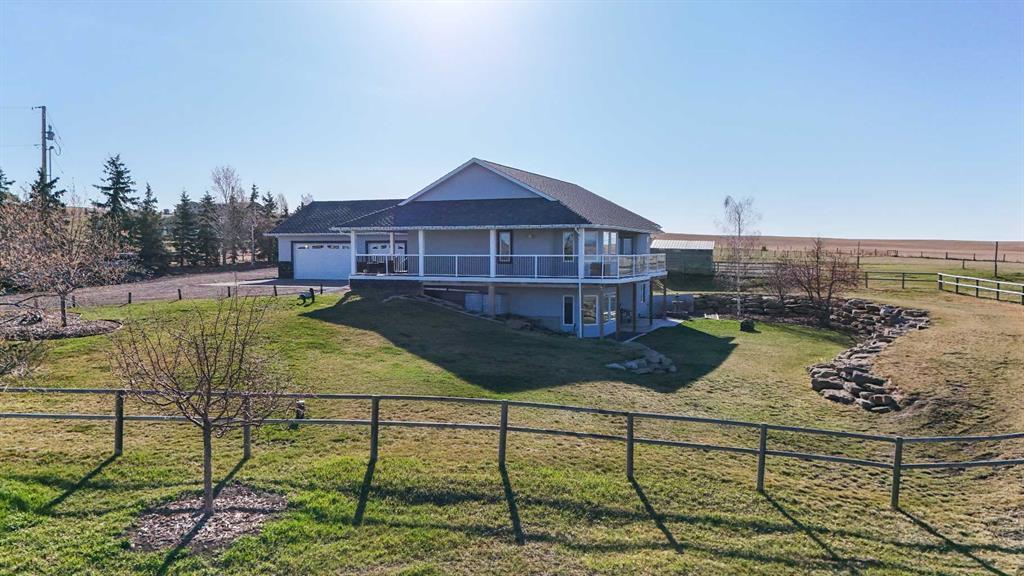 *** OPEN HOUSES CANCELED *** Welcome to this meticulously designed, high-end custom-built estate nestled on 4.27 beautifully landscaped acres with sweeping, unparalleled views of the Foothills and Rocky Mountains. Built in 2015, this one-of-a-kind property offers a rare blend of luxury, functionality, and rural serenity, just 10 years young and crafted with exceptional attention to detail. The walk-out bungalow home features a full wraparound deck with durable, low-maintenance Trex decking, ideal for enjoying panoramic views and peaceful evenings. Inside, comfort meets efficiency with a high-efficiency boiler and in-floor radiant heat in both the basement and oversized, triple garage (which boasts a 2 pce bathroom), complemented by central air conditioning throughout the home. Energy-efficient Low-E, argon-filled windows bring natural light to every corner, while the roof is fortified with 50-year rubber shingles for long-term peace of mind. Insulation exceeds standard specs in both the home and garage, ensuring year-round efficiency. Step outside to a fully insulated, radiant heated 40' x 40' detached shop with 14' high by 12' wide doors, reinforced concrete flooring, and extensive built-in shelving. Two deep side extensions (12'x40' and 16'x40') offer even more space. A 35-gallon air compressor with plumbed lines and retractable reels add to the shop's utility. A separate 8' x 8' garden shed and a dedicated horse shelter provide additional outdoor function. RV enthusiasts will appreciate the separate RV pad complete with full hookups-power, water, and septic-connected to its own dedicated tank and field. Two yard hydrants and a fully fenced, winterized livestock waterer make this property ideal for animal lovers. An electronic gate at the entrance allows freedom for your 4-legged friends and enhances overall security. Water is abundant and efficiently managed with a 1,500- gallon rainwater collection tank on the shop and a 3,500-gallon cistern inside of the home. Enjoy ultimate outdoor living with natural gas BBQ hookups on both the upper and lower decks. Inside, custom blinds grace the windows, offering privacy and style. Surrounded by over 100 mature trees and 26+ ornamental bushes, the lush and private setting provides a true oasis just minutes from town amenities. This property truly checks every box - custom quality, premium features, and a turn-key rural lifestyle.