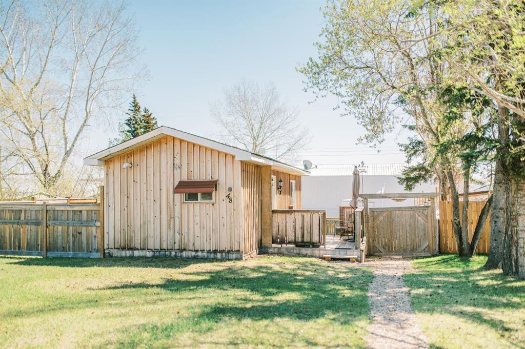 TURNKEY -This charming and efficient tiny home offers peaceful living on a beautifully kept, fully owned lot in the quiet town of Big Valley and INCLUDES the furniture and household goods. Ideal for a single owner or couple, this bachelor-style layout features a combined living and sleeping space, finished with hardwood and tile flooring, and warmed by a cozy gas fireplace—with electric baseboard heaters for backup.