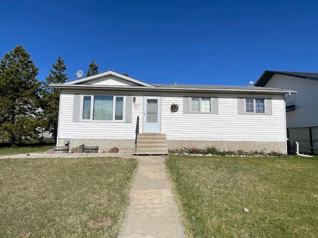 This extremely well maintained bungalow with detached garage is situated on two lots in Wembley with no rear neighbours. The well laid out main floor features a vaulted cedar ceiling in the living room and kitchen, an abundance of windows, a gas fireplace and convenient main floor laundry. The open concept kitchen and dining area offer a great view of the backyard and school yard with access to the rear deck with pergola. Three bedrooms including the primary with 2 piece ensuite complete this level. Downstairs is fully complete with a large rec room, 2 bedrooms, plenty of storage, a full bathroom and cold storage. The backyard is fairly private and has mature trees, RV parking, 2 sheds and of course the 22’ x 24’ heated garage with a newer overhead door. A great community with schools, recreation facilities, grocery shopping, a convenience store and much more. Wembley is home to the Award-Winning Philip J. Currie Dinosaur Museum and a short commute to the City of Grande Prairie.