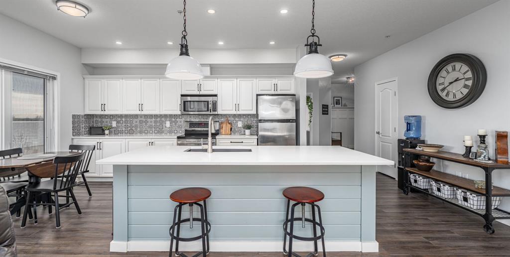 Adult condo living at its finest – now even better with stylish upgrades! This large, meticulously updated corner unit in Bridgestone Manor offers 1297 sq. ft. of bright, open-concept living with beautiful mountain views and 2 indoor, heated parking stalls, each with 4'x9' secure storage. Freshly painted throughout, this home features new laminate flooring, painted kitchen cabinets, a new tile backsplash, a brand-new kitchen island, and updated bathrooms including a modernized ensuite. The spacious primary suite offers a walk-in closet and updated 3-piece ensuite with walk-in shower. The second bedroom is generously sized, and the cozy solarium/den is the perfect spot to enjoy the stunning southwest mountain views. You’ll love the new accent wall in the front foyer, glazed windows for added efficiency, and 9’ ceilings with oversized windows for loads of natural light. Additional features include stainless steel appliances, ample cabinetry with pot and pull-out drawers, in-suite laundry, and plenty of storage. Bridgestone Manor is ideally located steps from Cornerstone Shopping Plaza (Walmart, Sobeys, Canadian Tire, Tim Hortons, and more), and just minutes to the Rotary Athletic Park of Olds. Amenities include a coffee room, mail area, elevator, wide hallways, and professional management. Condo fees cover heat, electricity, water, sewer, garbage, insurance, building maintenance, landscaping, and reserve fund. A rare find—2 heated indoor stalls plus storage, in one of Olds’ most walkable and convenient locations. Don’t miss this opportunity!