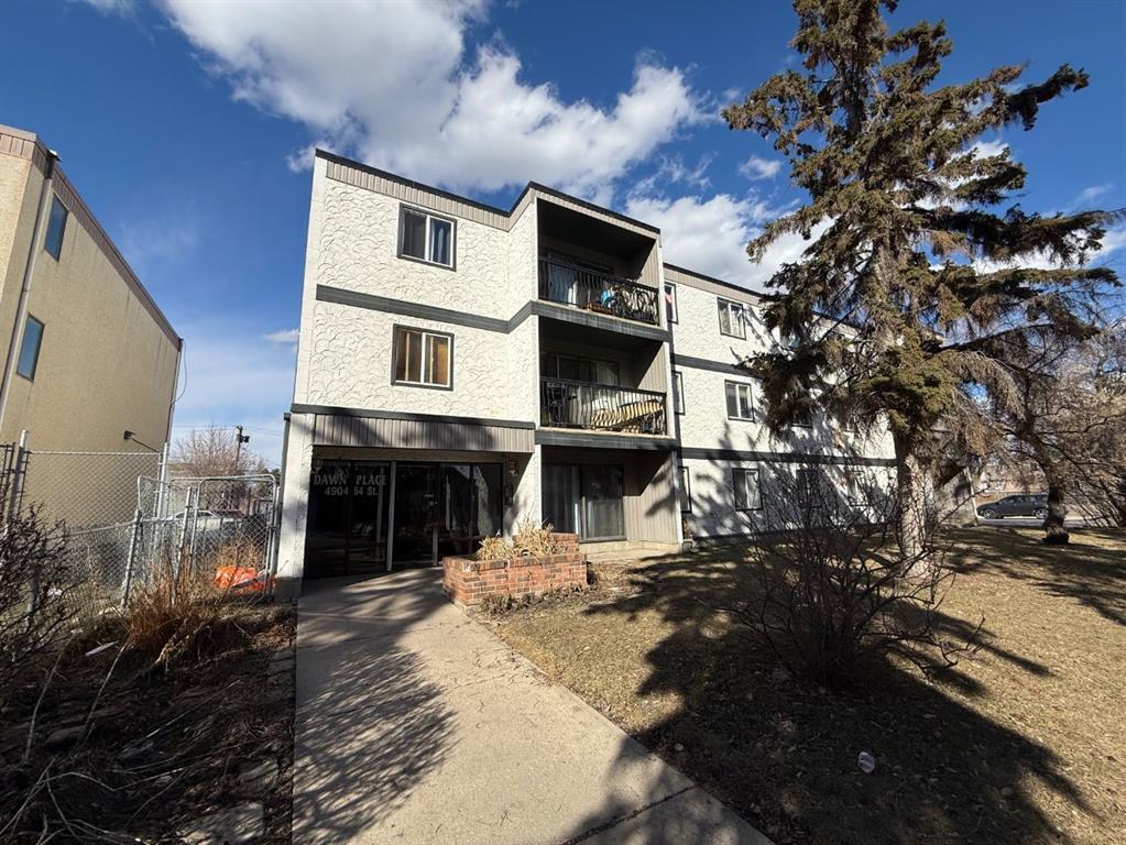 TOP FLOOR CORNER UNIT APARTMENT IN DOWNTOWN RED DEER! Offerings a spacious 994 square feet of living space this unit offers 3 bedrooms and 1 full four piece bathroom. Galley style kitchen with lots of counter and cabinet space, all appliances and a dining area. Huge family room allows for lots of space for a big cozy sectional and has sliding doors which lead to the east exposed balcony. One of the three bedrooms is located off of the family room and can easily accommodate a king bed along with extra furniture. The opposite side of the home offers two bedrooms, four piece bathroom, laundry and additional storage. Incredibly convenient location with access to the beautiful trail systems and all main amenities. This home is great for investors, students, and first time buyers. Low condo fee of $498.10/month which includes all utilities except for power & cable.