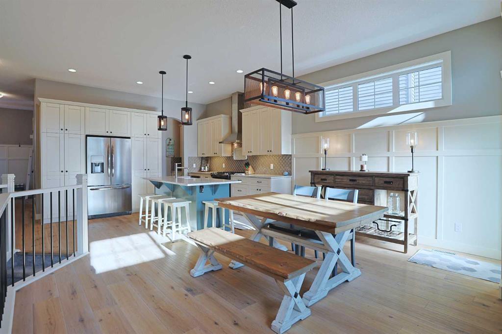 Welcome to your next home here in this beautifully appointed bungalow in Airdrie's popular family community of Coopers Crossing, nestled on this wonderful corner lot just steps to Discovery Park & only minutes to Central Pond, Coopers Town Promenade & schools. Over 2700sqft of stylish living in this one-owner custom-crafted McKee Homes beauty, which enjoys engineered rustic hardwood floors & quartz counters, 3 bedrooms + den, 3 full baths & your own private home theatre. Bathed in natural light & complemented by soaring 10ft ceilings, you'll love the open concept design of the main floor with its expanse of windows, sun-drenched living room with upgraded fireplace, spacious dining room area with access to the backyard deck & showpiece designer kitchen with soft-close cabinetry, butler's & walk-in pantries, farmhouse sink & stainless steel appliances including Frigidaire gas stove/convection oven. The relaxing owners' retreat has a great-sized walk-in closet & sleek ensuite with glass shower, separate make-up vanity & quartz-topped double vanities. The 2nd main floor bedroom is conveniently located across from the 2nd full bath. The lower level - with 9ft ceilings, is beautifully finished with a games/rec room with quartz-topped wet bar & under-the-stairs alcove with built-in bench, large 3rd bedroom, another full bath & home theatre complete with projection screen & projector, plus a 4th bedroom is framed & ready to be finished. Main floor laundry with Samsung steam washer & dryer. Additional features & extras include epoxy flooring in the garage, durable Hardie Board exterior, 8ft doors, custom window blinds & underground sprinkler system, Glowstone exterior lights & fenced pie-shaped backyard with deck (equipped with gas BBQ line) & pergola, stone patio & storage shed. Minutes from your front door is Coopers Town Promenade…featuring an open-air stage & firepit, office space, restaurants & a wide variety of shopping (anchored by Shopper’s Drug Mart & Save-On-Foods). Prime location in the highly desirable Southwest Airdrie neighbourhood within easy reach of the Sierra Springs Shopping Centre & quick access to 40 Avenue & the QE2, Cross Iron Mills & Calgary.