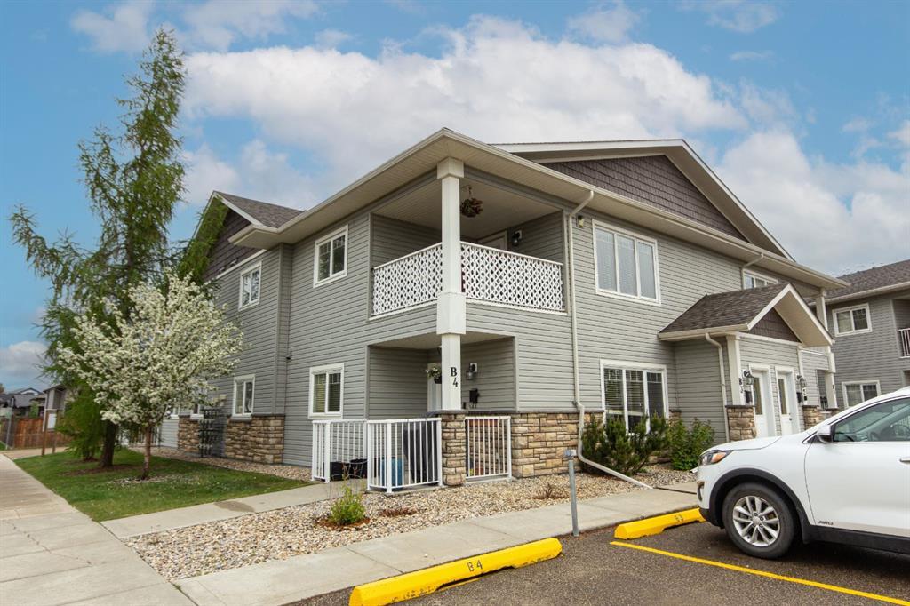 Step into comfort and convenience in this beautifully maintained 2nd floor condo in the growing family-oriented community of Blackfalds. Offering 910 sq ft of thoughtfully designed living space, this home is perfect for first-time buyers or young families looking for modern style and everyday functionality. Enjoy the open concept floor plan featuring rich hardwood flooring throughout the main living areas. The spacious living room is filled with natural light from a large picture window and a garden door that opens to your covered south and west-facing balcony. The kitchen offers plenty of functionality with an abundance of oak cabinetry, ample counter space including a convenient island, matching black appliances, and a corner pantry for added storage. The dining space creates the perfect spot for family meals or hosting friends. There are two nicely sized bedrooms, including the primary bedroom that can easily accommodate a king-size bed and features dual closets. The two bedrooms share a 4-piece bathroom, and in-suite laundry with storage add to the home’s practicality. Parking is convenient with your assigned stall and two visitor stalls just steps from your front door. Condo fees of $284.51/month cover exterior insurance, exterior maintenance, snow removal, and professional management—making for low-maintenance homeownership. Located within walking distance to schools, parks, playgrounds, shopping, and restaurants, this home blends quiet residential living with unbeatable accessibility.
