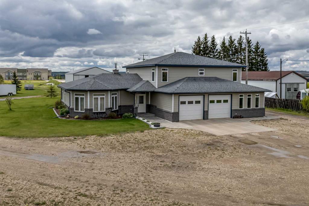 WELCOME TO ACREAGE LIVING IN THE CHARMING TOWN OF RIMBEY! Here is a very impressive/unique property situated on the West side of Rimbey! Enjoy the spacious 2.5 treed acre lot while having the amenities of in town living! This property has SO much to offer featuring a large 2 storey home with TONS of attached garage space, room for future business endeavors, office space, large outdoor quonset space and a beautiful yard with tons of parking! Zoned Urban Holdings allows more opportunities than most residential lots. The home itself is built with pride and upon entry you will find a nice bright living area with wood stove, beautiful hardwood flooring, tons of natural lighting, patio doors off the dining area to a poured concrete patio space with large gazebo and a bright well appointed kitchen with beautiful views. This home features in floor heating on main level and north attached garage with a brand new boiler system and wood stove to make this perfect for keeping warm in the winter months. Upstairs features a large primary with ensuite a second and third bedroom or office space, second bathroom, plus a bright open space with patio doors for an additional recreational area. The double attached in floor heated garage in front gives plenty of room for parking, along with a single attached garage on west side of home for toys and extras. The back of the home features a massive heated attached garage with 120V power and large mezzanine for those in need of multiple work areas and indoor storage. There is also an office space on the west side of house with separate entry, plus 2 more storage/parts rooms, a half bath, all with access to all 3 attached garages. The property itself has tons of amazing outdoor space for many different options as well as a massive quonset in the back for even more outdoor storage! This acreage with its ample opportunities, beautiful living space and impressive work space, is truly unique and a must see for those seeking this type of property!