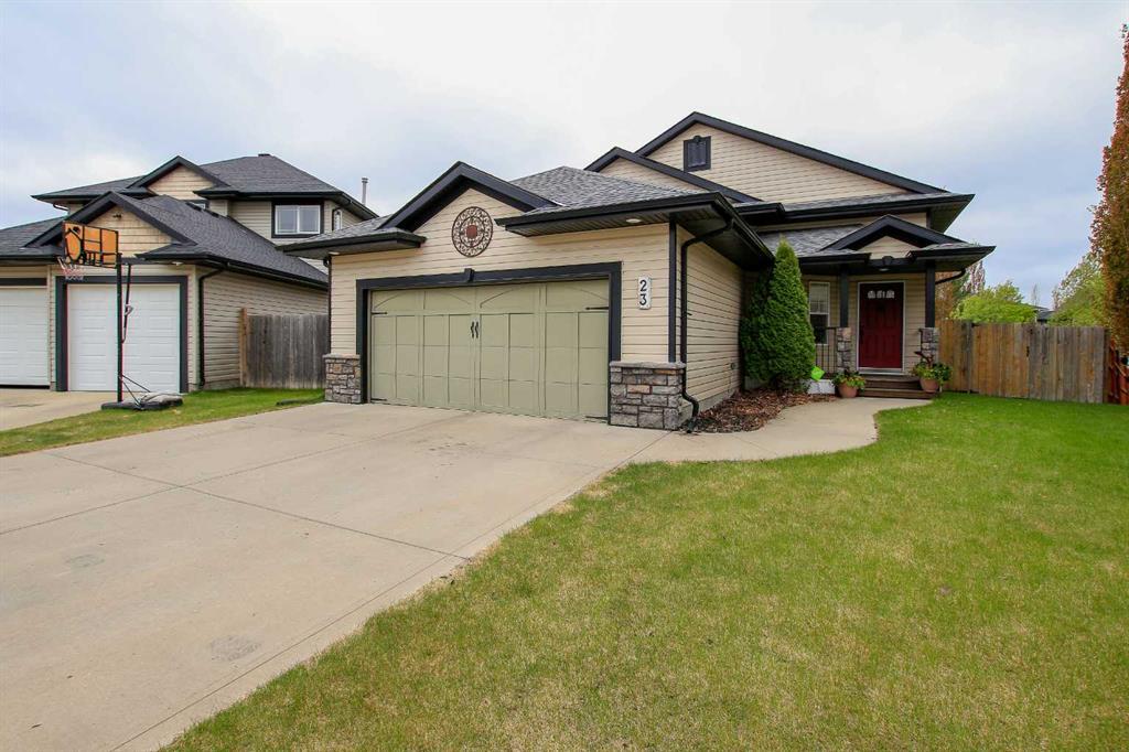 FULLY DEVELOPED 4 BEDROOM, 3 BATHROOM BI-LEVEL ~ LOCATED IN A CLOSE ON A LARGE PIE LOT ~ BEAUTIFULLY LANDSCAPED WEST FACING BACK W/KOI POND ~ Covered front entry welcomes you and leads to a large sun filled foyer with raised ceilings, ample closet space and convenient access to the garage ~ Open concept main floor layout is complemented by high ceilings ~ The living room features raised ceilings and has an oversized west facing window that allows natural light to fill the space ~ The kitchen offers an abundance of dark stained cabinets, granite counter tops, island with a raised eating bar, full tile backsplash and a large walk in pantry ~ Easily host large gatherings in the dining room with garden door access to the west facing deck, featuring composite deck boards and a BBQ gas line ~ The primary bedroom can easily accommodate a king bed plus multiple pieces of furniture, has a large walk in closet with built in shelving and organizers, and offers a spa like ensuite featuring a huge walk in tile shower with two shower heads ~ Second main floor bedroom is conveniently located next to the 4 piece main bathroom ~ The fully finished walkout basement has large above grade windows and offers a large family room with a wet bar, gas fireplace with floor to ceiling tile and a separate entrance leading to the lower covered patio, hot tub (included with the sale) and backyard ~ 2 additional bedrooms are both a generous size and have ample closet space ~ 4 piece bathroom features heated tile floors and an extra deep soaker tub ~ Front load laundry pair, with pedestals, are located in their own room ~ 24' L x 22' W attached garage is insulated, finished with painted drywall, and has a man door to a fenced in dog run and the backyard ~ The sunny west facing backyard is beautifully landscaped with well established trees, shrubs and perennials, plus a large covered patio and hot tub area, a relaxing koi pond with a waterfall next to the stone fire pit, includes a garden shed and is fully fenced with back alley access ~ Located in a key hole close, walking distance to multiple schools, parks, playgrounds, walking trails and with easy access to shopping and all other amenities.
