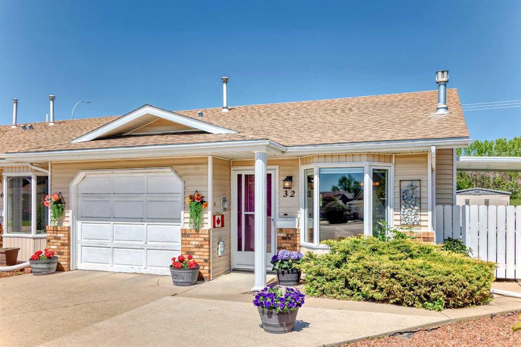WELCOME home to this Meticulously Maintained 2-Bedroom End Unit – NO Condo Fees! This charming adult-oriented community offers exceptional value and peace of mind. Nestled in a cul-de-sac, it's the perfect fit for downsizers, retirees, or anyone looking for main floor living with no stairs! Pride of ownership shines through with updated flooring and paint, making this home truly move-in ready. Enjoy year-round comfort with the gas fireplace in the livingroom to cozy up to on those chilly evenings. The spacious kitchen features oak cabinetry, a built-in desk, newer appliances (stove & fridge), and garden doors with a phantom screen leading to a covered, east-facing patio—perfect for morning coffee. The single attached garage provides direct home access, and the widened driveway adds bonus parking. Need storage? A 4-foot crawl space offers abundant room with the concrete floor. The large backyard includes a handy storage shed, both a covered and non-covered patio . This style of home doesn't appear on the market very often and offers a place to relax, entertain, and enjoy.