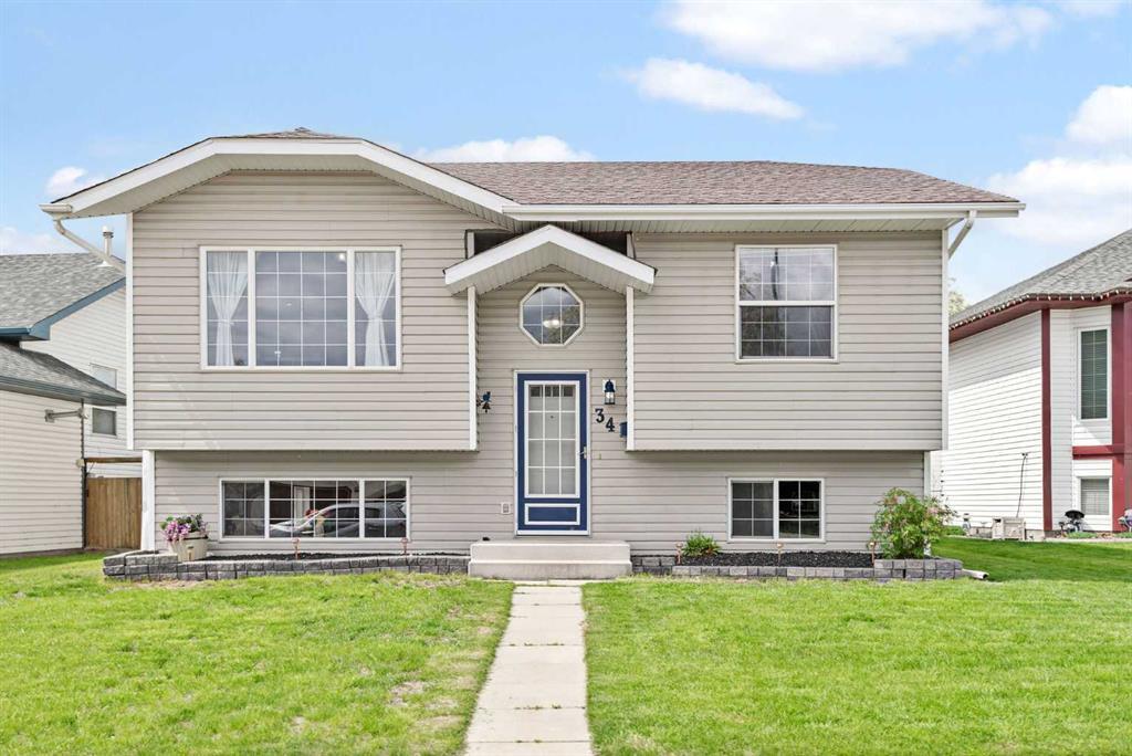 Cozy and comfortable 1,065 sq. ft. bi-level home in Blackfalds! The lot boasts a Large fenced yard ~ Large deck ~ Offstreet parking. Inside you'll find the kitchen and dining area opening onto the west-facing deck overlooking a fenced yard with mature trees, a fountain and space for a double garage development. Additional features include high vaulted ceilings ~ ceiling fan in the living area & moveable kitchen island. The basement is unfinished and is an open canvas for your creative design! It currently offers storage, a laundry room, and potential for a few more bedrooms and additional living room! What a great option for first-time buyers or those looking to downsize!