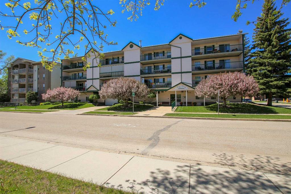 IMMEDIATE POSSESSION AVAILABLE ~ 1067 SQ. FT. 2 BEDROOM, 2 BATH CONDO ~ END UNIT WITH A COVERED WEST FACING BALCONY ~ UNDERGROUND PARKING ~ Open concept main living space is complemented by laminate flooring and an abundance of south and west facing windows that fill the space with natural light ~ The living room is a generous size and has a sliding patio door leading to the covered balcony with mature trees offering privacy and shade ~ Easily host gatherings in the dining room that opens to the galley style kitchen featuring white cabinets, full tile backsplash and ample counter space ~ The primary bedroom can easily accommodate a king size bed plus furniture, has dual closets and a 3 piece ensuite with a walk in shower ~ Second bedroom is also a generous size and is conveniently located next to the 4 piece main bathroom ~ In unit laundry has built in shelving ~ Balcony storage with built in shelving ~ Heated and secure underground parking stall ~ The building offers a party room with a wet bar, bathroom, elevators, underground parking and an outdoor sitting area ~ Monthly condo fees are $585.45 and include; heat, insurance, gas, common area maintenance, grounds maintenance, parking, professional management, reserve fund contributions, sewer, snow removal, trash and water ~ Located across from the Recreation Centre Park, Museum & Art Gallery and The Golden Circle, walking distance to transit, shopping restaurants, medical clinics and more ~ Immediate possession and move in ready!
