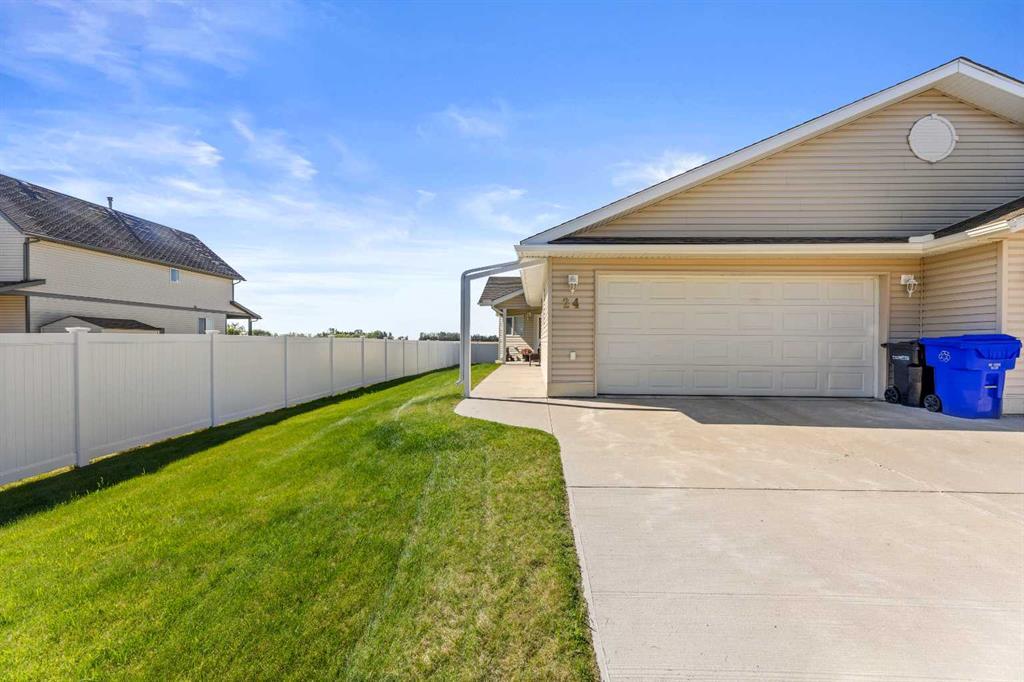 ½ Duplex CONDO WITH A BEAUTIFUL VIEW! Unobstructed Southwest View looking out into the field and MOUNTAINS with a green space on the east side too! This END UNIT is one of the most desirable locations in the adult 55+ community of “The Meadows”. The floor plan features a spacious open concept w/vaulted ceilings, corner gas fireplace, 2 piece bath, and a main floor laundry and sink w/entrance to the DOUBLE attached garage. The living room WITH THIS FANTASTIC VIEW faces south with a door to the covered rear deck. The updated kitchen/eating area is open, large and has loads of wonderful countertop/cupboard/storage space. The kitchen boasts double sinks, quartz countertops, and a raised eating bar. The large PRIMARY bedroom has a window seat, large walk-in closet and 3 piece ensuite with a stand alone shower. The nice sized second bedroom on the main floor is currently being used as an office with the convenience of a 20 amp circuit for computer/printer. The basement is fully developed with a cozy family room with storage closet and surround sound roughed in, two other large bedrooms, 4 piece bath and loads of storage! Underfloor heating is in the basement as well. The home has LEVEL ENTRY from the front door and as well as the garage. Many upgrades in the last five years include newer appliances, window blinds, and double hot water tanks in 2022, and water softener in 2020 to name a few. Arguably one of the nicest lots, with a south facing covered deck and backyard, very well kept, and in a great neighborhood. Condo Fees include use of the clubhouse, snow removal, lawn care, exterior building insurance and RV Parking if available. For those looking for a virtually maintenance free property, then this is the place for you!