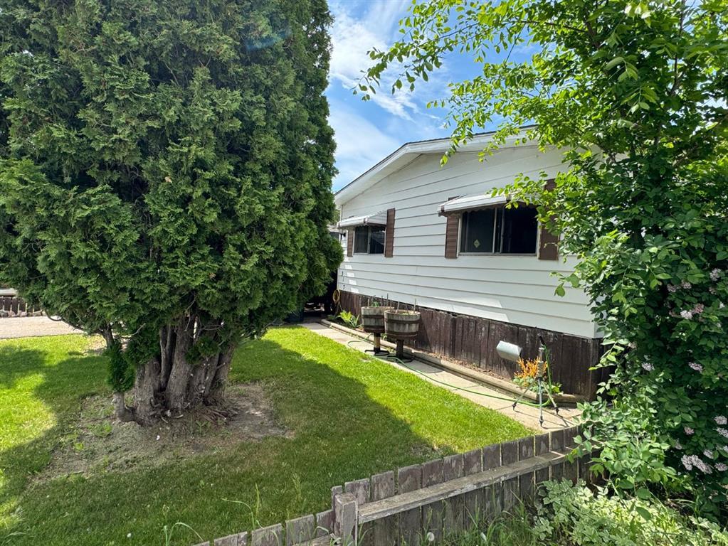 Welcome to 317 Fleet Street SW — a spacious and charming double-wide mobile home offering exceptional value with no lot fees. This property is full of potential and ready for your personal touch. Set on one of the most scenic lots in the park, this bright and well-laid-out home features 2 bedrooms plus a den, a full bathroom, and a private deck just off the den—ideal for morning coffee or evening relaxation. The open-concept kitchen and living area provide plenty of space for both everyday living and entertaining. Outside, you’ll find a tranquil backyard oasis, beautifully shaded by a mature evergreen tree, perfect for relaxing afternoons. The property backs onto an open field, adding a sense of privacy and space, while the front yard is framed by three lovely trees, offering both shade and curb appeal. Whether you’re looking to update, personalize, or move right in, this home presents a rare opportunity to enjoy peaceful, lot-fee-free living in a truly peacful setting.