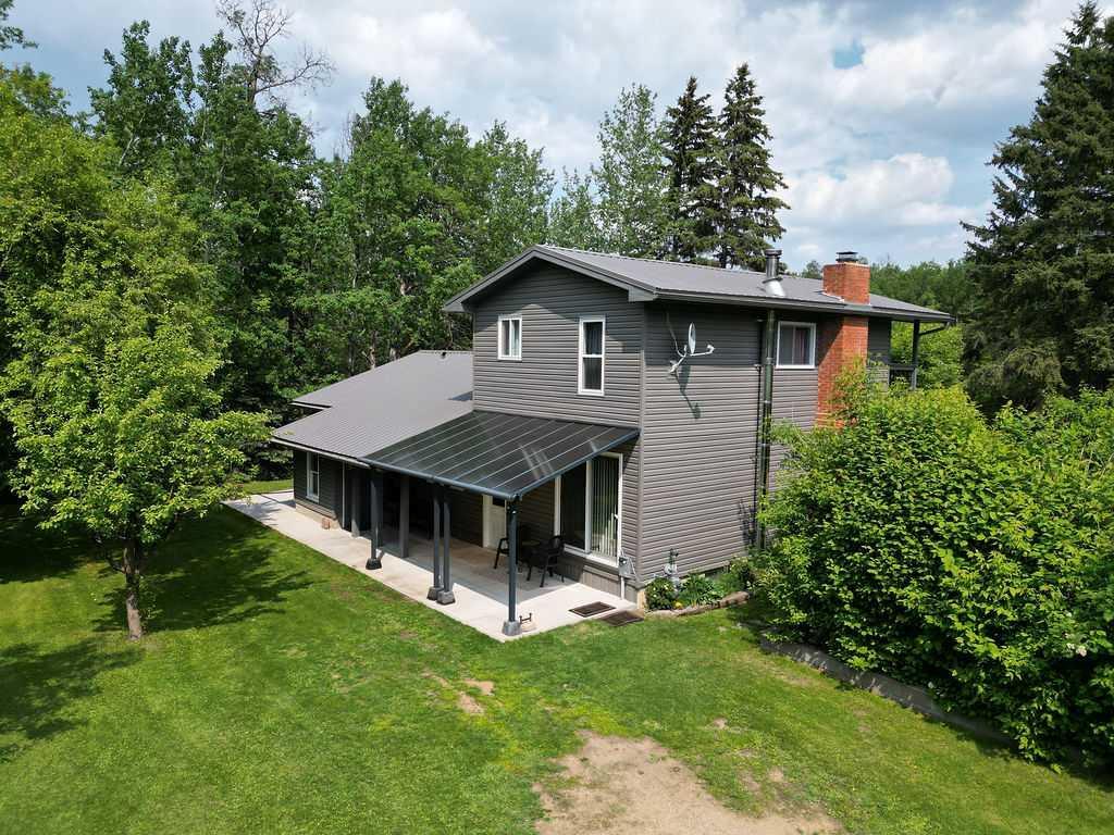 Beautiful, serene and meticulously well kept country acreage. With many renovations and updates this gorgeous 4 bedroom, 2 bath home on 11.49 acres will have you falling in love the second you arrive. The home features 2 large bedrooms upstairs with a share ensuite and a balcony off the master bedroom upstairs. On the main floor you have 2 bedrooms, a 4 piece bathroom, large kitchen with updated appliances and countertops, living room complete with hardwood floors and spacious dining room. The sliding doors off the dining room take you to your picture perfect covered and screened in 12'x26' patio/cookhouse - perfect to relax, entertain or unwind. The basement has plenty of storage, laundry room and rec room with wood stove. The home has seen many renovations and updates including new metal roof, eavestroughs, soffit, fascia, siding and flooring. There is a double detached garage with new siding and overhead doors, an older shop that is still in decent shape large enough to store equipment or a great place to work and a closed in pole barn - perfect for all your yard storage. 2 water wells. Curb appeal is 10/10 and shows the same.