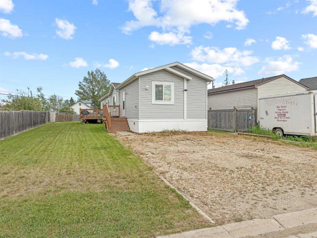Welcome to 9815 101 Street in the welcoming town of Wembley, Alberta. This 2019 manufactured home is anchored on concrete pilings, making it a secure permanent structure on a spacious lot. The large yard offers endless potential whether you're dreaming of adding a garage, planting a garden, or creating RV parking. A charming side patio is the perfect place to enjoy quiet mornings or relaxed evenings. Inside, this bright and sunny home offers a functional layout with three bedrooms and two full bathrooms. The primary suite includes a walk-in closet and private ensuite, while one of the additional bedrooms also features its own walk-in closet, making this home ideal for roommates, shared living, or a rental setup. Whether you're a first-time buyer, downsizing, or adding to your investment portfolio, this property offers smart, flexible options. The kitchen is stylish and practical with white cabinetry, stainless steel appliances, and a pantry for added storage. The open-concept living area is spacious and filled with natural light, perfect for entertaining or relaxing at home. Conveniently located just minutes from local amenities and the Philip J. Currie Dinosaur Museum, this home offers both small-town charm and easy access to services. A great opportunity for homeowners and investors alike. Don’t miss your chance to own this affordable, well-maintained gem in Wembley.