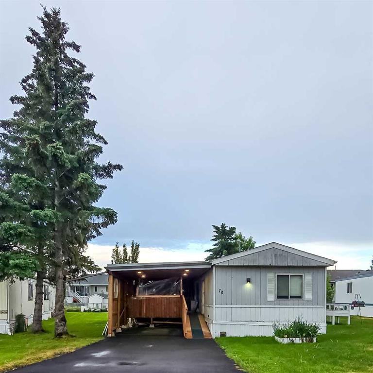 Quick Possession Available ~ 78 Parkland Acres, Lacombe ~ Affordable opportunity in Parkland Acres! If you’re looking for a well-priced 3 bedroom and 2 bathroom home with potential, this is the one for you! Situated at the entrance of the Parkland Acres mobile home community, this 1989-built home offers 1,124 sq. ft. of living space PLUS the addition (265 sq ft) which was added about 3 years ago. The open-concept kitchen, eating area, and living room is the centre of the home with the benefit of a vaulted ceiling above. The home features vinyl plank flooring throughout and stainless steel appliances. The home could benefit from some freshening up, so with a little creativity, you can turn this home into your own personal space. Towards the back of the home, there is an exit door with a dedicated laundry and furnace room with built in cabinets & storage space. The primary bedroom, located at the back of the home, comes with a 4-piece ensuite bathroom and walk-in closet. At the front of the home there are 2 bedrooms, a full main bathroom and a 3rd exit door leading out to the carport, porch and addition. The addition (added about 3 years ago) provides extra living space with good sized vinyl windows and another exit door to the back yard. The carport offers sheltered parking, and the side ramp ensures accessibility for everyone. What would you do with the covered porch space? There are 2 sheds in the backyard for outdoor storage and several garden boxes. FYI: the home was just recently levelled. Monthly lot rent is $600, which includes garbage, water, and sewer fees. As an owner, grass cutting is your responsibility. Landlord approval is required for occupancy and 1 pet per home approval. (The community allows 1 dog under 16 inches.) Parkland Acres is nestled in the heart of Lacombe, close to schools, parks, shopping, various amenities and beautiful pathways. This is a great spot to settle in and put your stamp on a home in beautiful Lacombe Alberta!